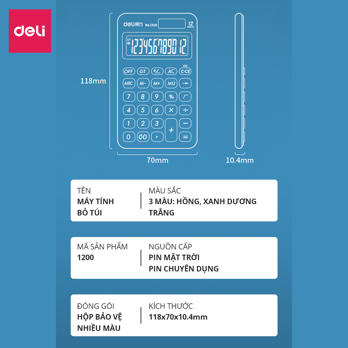✨Máy tính cầm tay bỏ túi 12 số để bàn Deli có thể dùng năng lượng mặt trời và pin - Phù hợp văn phòng và học sinh - Nhiều màu - 1200