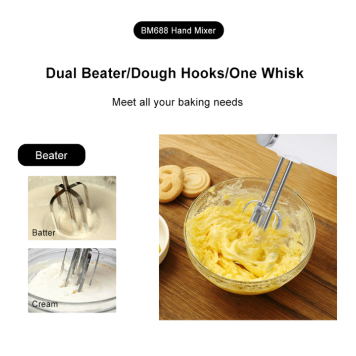 - Máy đánh trứng Biolomix BM688 có các chức năng chính là đánh trứng, đánh bột, đánh kem, giúp chị em có thể làm bánh mì, bánh bông lan và nhiều loại bánh khác, làm kem tại nhà dễ dàng. Dụng cụ đi kèm đầy đủ