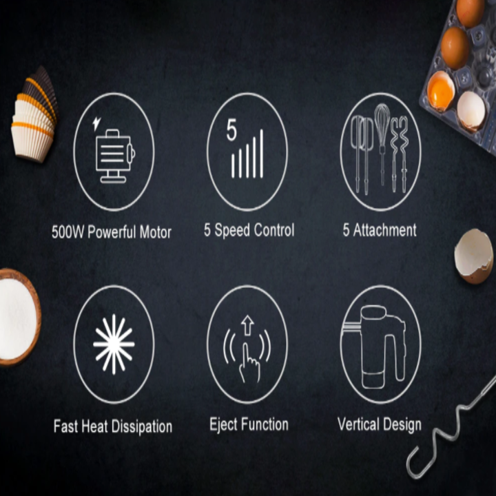 - Năm phụ kiện trộn an toàn và hợp vệ sinh: Máy trộn rộng hơn và móc trộn bột dễ dàng vệ sinh; máy trộn tay hoạt động mà không có tiếng ồn mạnh. Các phụ kiện mạ crom rất thích hợp để đánh bông lòng trắng trứng, các nguyên liệu làm kem và cho hỗn hợp bánh nhẹ hoặc bột đánh bông.