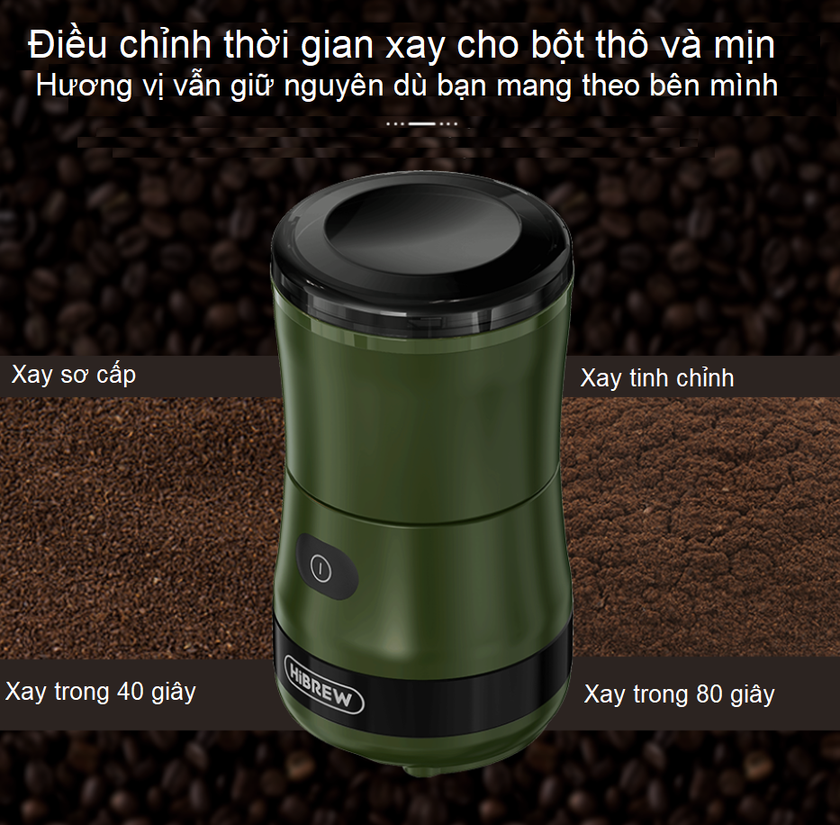 - Máy xay hạt cà phê dùng pin cầm tay 3 trong 1 HiBREW G2 sở hữu thiết kế nhỏ gọn cùng cơ chế vận hành đơn giản, các bạn có thể mang theo khi đi leo núi, cắm trại hay đi du lịch cùng gia đình.