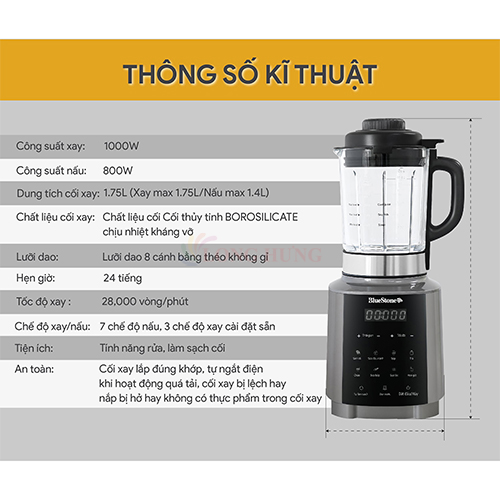 Máy xay nấu đa năng Bluestone BLB-6035 - Đa chức năng với 6 chế độ cài đặt sẵn: Sữa hạt, cháo dinh dưỡng, sữa bắp, súp, sinh tố, sữa lắc - Cối thủy tinh dung tích cối lớn 1.75L, chịu nhiệt, chịu lực tốt - Lưỡi dao 8 cánh thép không gỉ - Chế độ tự làm sạch sau khi sử dụng, tiện ích hẹn giờ lên đến 12 tiếng - Công suất gia nhiệt 900W - Công suất xay 800W - An toàn với tính năng vận hành khi lắp đúng khớp, tự ngắt điện khi quá tải - Tốc độ xay 35,000 vòng/phút xay nhanh chóng - Bảng điều khiển cảm ứng tiếng Việt dễ dàng sử dụng - Đảo chiều làm nóng thực phẩm 360 độ - Bảo hành: 24 tháng LƯU Ý KHI MUA HÀNG: Cảm ơn quý khách đã quan tâm đến sản phẩm bên shop, quý khách vui lòng dành ít thời gian đọc kĩ chính sách bảo hành đổi trả: Shop nhận đổi trả trong trường hợp hàng sai mẫu, size, màu do shop gửi. Bên shop chỉ giải quyết khiếu nại khi quý khách có video clip khi mở/nhận hàng. Bảo hành đối với sản phẩm chính hãng, quý khách trực tiếp mang sản phẩm bảo hành tới trung tâm bảo hành của hãng. Đối với các sản phẩm nhập khẩu , quý khách gửi sản phẩm về lại bên shop để được kiểm tra (khách hàng chịu phí vận chuyển khi gửi sản phẩm bảo hành). Không nhận đổi trả khi sản phẩm bị hư hại do tác động ngoại lực từ người mua như móp, bể, trầy xước, nổ điện, rớt nước, rách tem bảo hành, không đầy đủ phụ kiện và hộp. Vì lượng hàng hoá nhiều shop không nhận đổi trả trong trường hợp khách không thích, không ưng màu, chất liệu; quý khách vui lòng đọc kĩ mô tả và xem hình ảnh cụ thể; nếu cần hãy chat với shop để được tư vấn