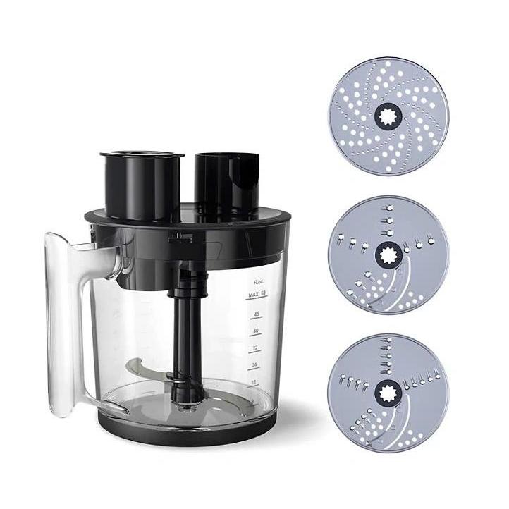 Phụ kiện đi kèm ️ Cối xay đa năng 1.7L: cắt, băm, nghiền, thái lát (mỏng/dày), cắt sợi, nghiền khoai tây hoặc phô mai. ️ Cối xay nhỏ 0.5L: cắt rau thơm, hành, hạt, thịt… tiện lợi khi nấu ăn hàng ngày. ️ Phới lồng đánh trứng: đánh bông kem, sốt mayonnaise, bột bánh kếp, salad. ️ Cốc đong kèm nắp: hỗ trợ pha chế và bảo quản.
