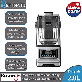 Máy xay sinh tố tự động hút và xả chân không dành cho kinh doanh hiệu Kuvings hoạt động liên tục 3 phút một lần xay và xay được 200+ ly mỗi ngày, gồm 1 cối xay với công suất cực mạnh 3.5 HP – 32,000RMP, 35 công thức tối ưu hóa cho menu quán cà phê, sinh tố được tích hợp sẵn cùng với 5 chế độ nhớ, dao xay cao cấp chuyên dụng cho kinh doanh không sinh nhiệt với công nghệ xay 3 chiều trong môi trường chân không cho nước sinh tố mịn hơn, màu sắc tươi hơn, chậm tách nước, ít bọt và giữ được nhiều Vitamin, Enzym trong rau củ quả. Bảng điểu khiển một chạm cảm ứng để điều chỉnh 5 chế độ xay tự động, chế độ xay nhanh, chế độ xay thủ công và nhồi, tự động đóng mở nắp, nắp chống ồn, chế độ tự động ngắt điện an toàn khi quá tải hay quá nóng và khóa an toàn khi gắn cối xay không đúng cách, có chế độ tiết kiệm điện tự động, thuận tiện sử dụng kinh doanh nhà hàng, quán bar, quán cafe, khách sạn, màu Inox. • Xuất xứ thương hiệu: Hàn Quốc • Sản xuất tại: Made in Korea • Hoạt động liên tục: không quá 3 phút 1 lần xay • Tốc độ vòng quay: 32,000RPM • Loại: Tự động hút xả chân không – Tự động đóng mở nắp – Chống ồn • Sử dụng kinh doanh nhà hàng, quán bar, quán cafe, khách sạn và xay được 200+ ly mỗi ngày • Dung tích cối xay: 2.0L (Khuyến khích sử dụng 1.4L) • Công suất: 220-240V, 1700W ĐẶC ĐIỂM NỔI BẬT Máy cung cấp 35 công thức được tích hợp sẵn, có thể tùy chỉnh tối ưu và phù hợp với từng loại hình kinh doanh của quán. Bảng điều khiển 5 nút cài đặt trước giúp phân loại và thực hiện nhanh các món nước đặc trưng của quán như cà phê đá xay, sinh tố, nước ép, milkshake v…v - Trước khi xay, máy sẽ hút không khí trong bình ra, ngăn trái cây tiếp xúc không khí, làm chậm quá trình oxi hóa, ngăn chặn hao hụt dinh dưỡng, các chất enzyme có lợi trong trái cây khi xay. - Với tính năng hút chân không, sẽ giữ trọn giá trị dinh dưỡng của sinh tố giúp sinh tố không bị tách nước, không bọt, trữ 5 đến 7 ngày, màu sắc tươi đẹp giống như trái cây ban đầu. - Thiết kế đáy cối xay tạo độ dốc để trộn đều hết nguyên liệu mà các máy xay khác chưa làm được, dao 6 lưỡi 3 chiều không sinh nhiệt và công suất siêu mạnh 1700W, chưa đầy 1 phút sẽ cho ra sinh tố mịn, nhuyễn. - Tích hợp nắp chống ồn giúp máy hoạt động êm ái ngay cả khi xay với tốc độ nhanh và công suất mạnh. - Đóng nắp chỉ với một nhấn, xả chân không và mở nắp tự động khi hoàn thành, hiện đại tiện lợi, tiết kiệm thời gian. THÔNG SỐ KỸ THUẬT - Tên sản phẩm : Máy xay sinh tố - Loại : Chân không – Chống ồn – 3 trong 1 – Sử dụng cho gia đình và quán nhỏ - Hoạt động liên tục : không quá 3 phút - Có bình lưu trữ chân không, sách hướng dẫn công thức làm các loại sinh tố, nước ép, sữa ngũ cốc, súp, nước sốt, kem và cây khuấy thực phẩm kèm theo sản phẩm - Model : CB1000 - Thương hiệu : Kuvings - Xuất xứ thương hiệu : Hàn Quốc - Sản xuất tại : Hàn Quốc - Thời gian bảo hành : 12 tháng chính hãng -