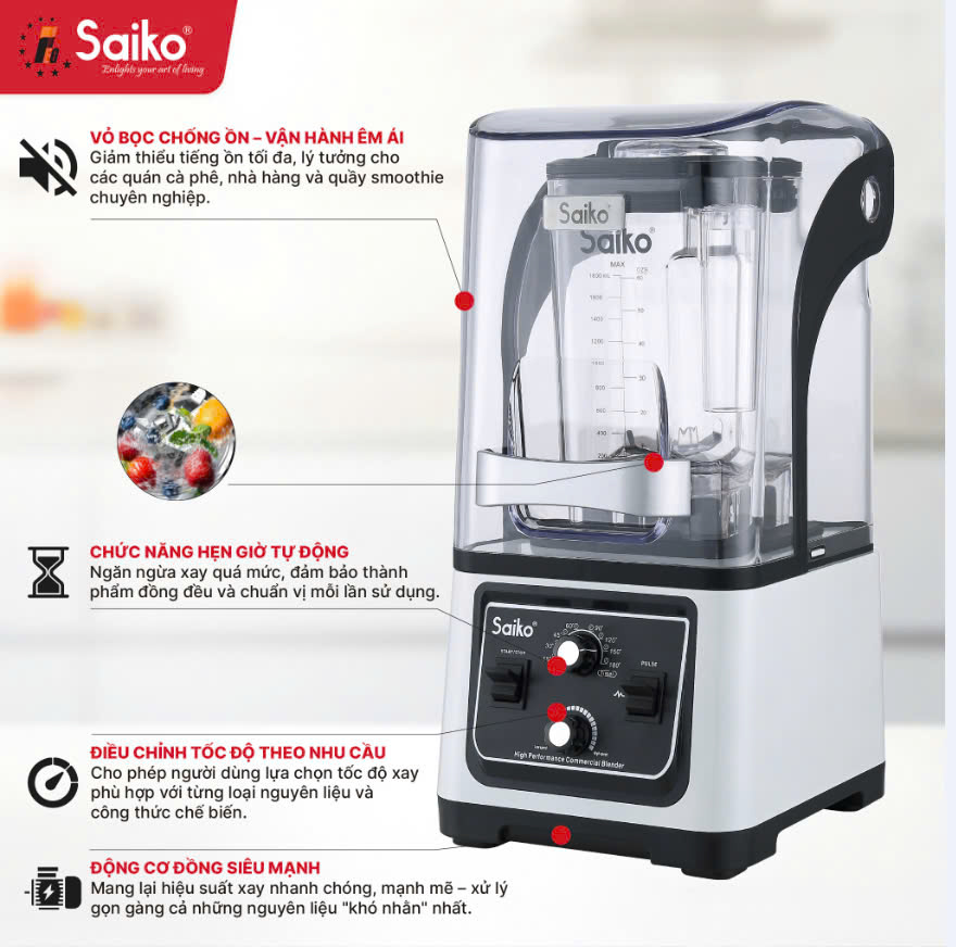 ĐẶC ĐIỂM NỔI BẬT Máy xay sinh tố công nghiệp Saiko BLG-2800 PRO – Sức mạnh bền bỉ, hiệu suất vượt trội cho mọi mô hình kinh doanh Khi công suất và độ bền là