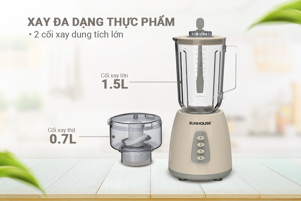 Với 2 cối xay dung tích lớn 1.5L và 0.7L, máy xay sinh tố Sunhouse SHD5331 không những đáp ứng nhu cầu xay nhiều của gia đình mà còn giúp xay đa dạng các loại thực phẩm khác nhau, từ trái cây đến thịt, cá, ….
