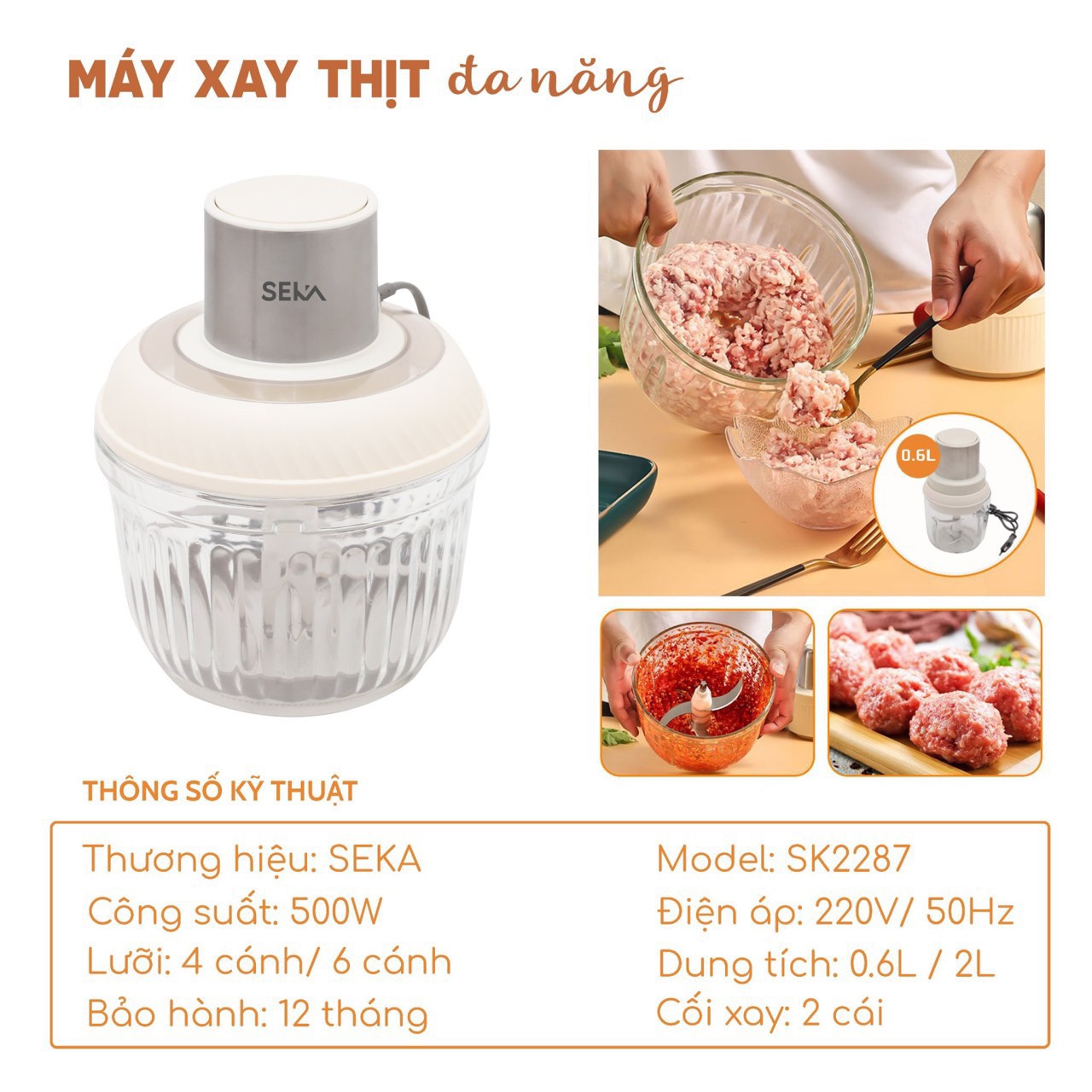 Mua tại TiktokMáy xay thịt đa năng SEKA SK2287, 2 cối thủy tinh, thiết kế 4 - 6 lưỡi dao sắc bén, Công suất mạnh 500W Với công suất mạnh mẽ và dung tích lớn 2L cùng với 2 cối SEKA SK2287 là công cụ xay cắt thực phẩm hoàn hảo cho đại gia đình. Bằng thao tác đơn giản, người dùng có thể dễ dàng chế biến đa dạng nguyên liệu tươi như thịt, hành, rau thơm, đậu phộng và nhiều thực phẩm khác. ĐẶC ĐIỂM NỔI BẬT CỦA MÁY XAY THỊT SEKA: