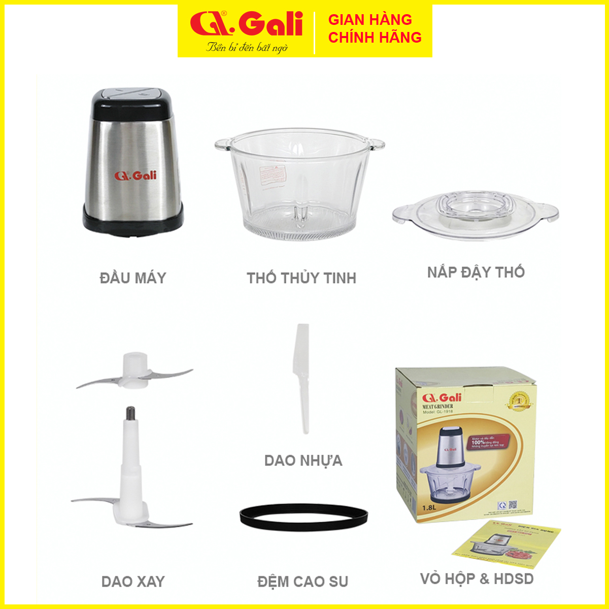 - Máy xay thịt đa năng Gali nhỏ gọn và tiện dụng cho mọi gia đình. Máy xay thịt mi ni Gali với chức năng xay cá, thịt, ngũ cốc, trái cây, cháo, súp, một cách nhanh chóng chỉ trong vài phút với một lần nhấn nút. Các đặc điểm nổi bật của máy xay thịt Gali GL-1918