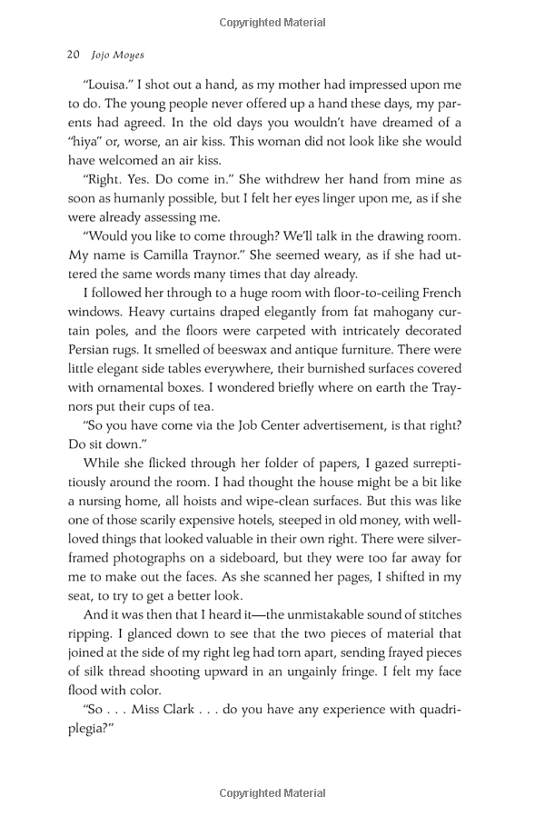 Will is acerbic, moody, bossy-but Lou refuses to treat him with kid gloves, and soon his happiness means more to her than she expected. When she learns that Will has shocking plans of his own, she sets out to show him that life is still worth living.