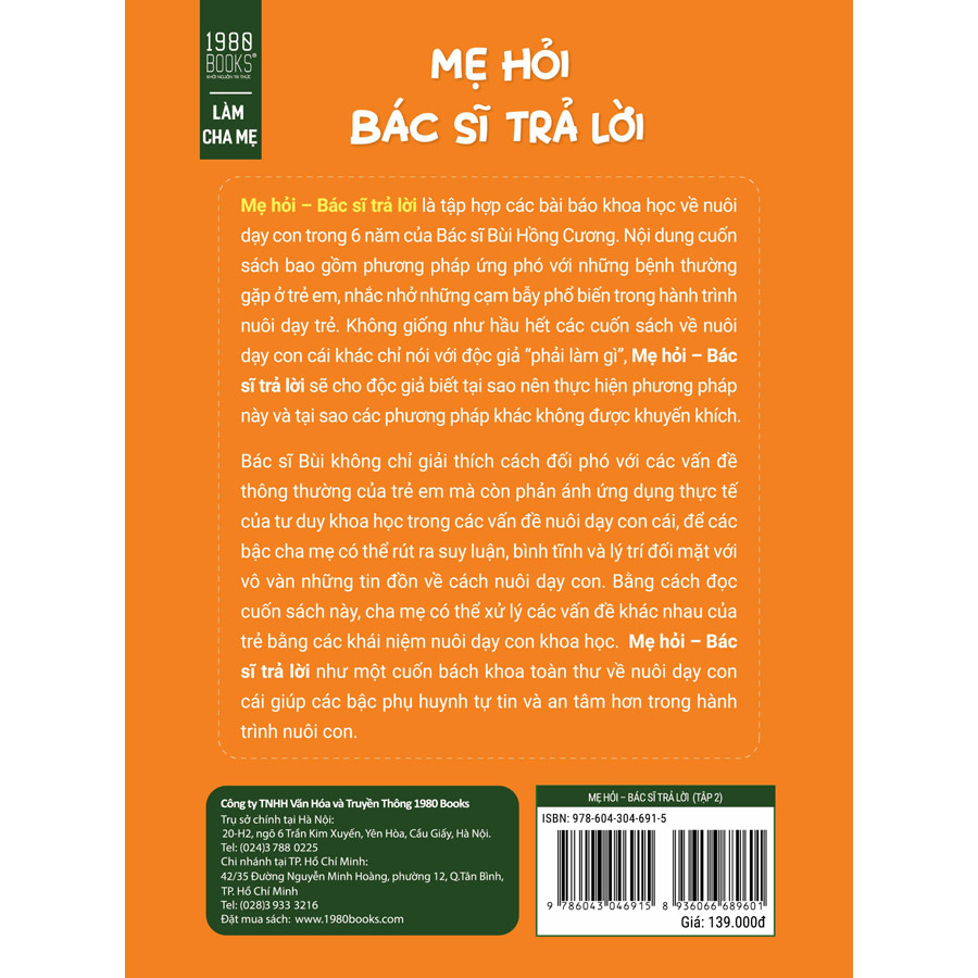Mẹ hỏi – Bác sĩ trả lời là tập hợp các bài báo khoa học về nuôi dạy con trong 6 năm của bác sĩ Bùi Hồng Cương. Nội dung cuốn sách bao gồm phương pháp ứng phó với những bệnh thường gặp ở trẻ em, nhắc nhở những cặm bẫy phổ biến trong hành trình nuôi dạy trẻ.
