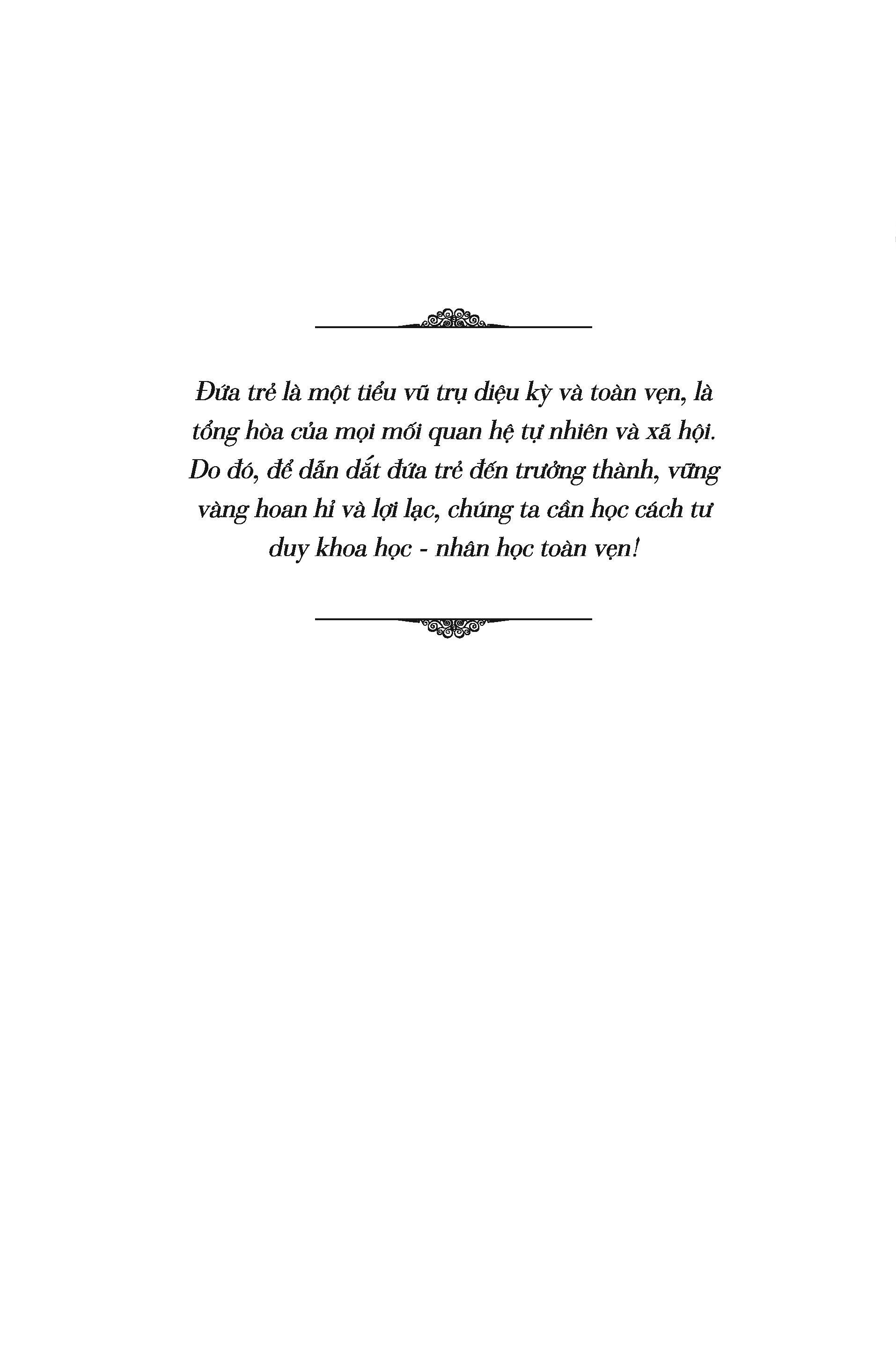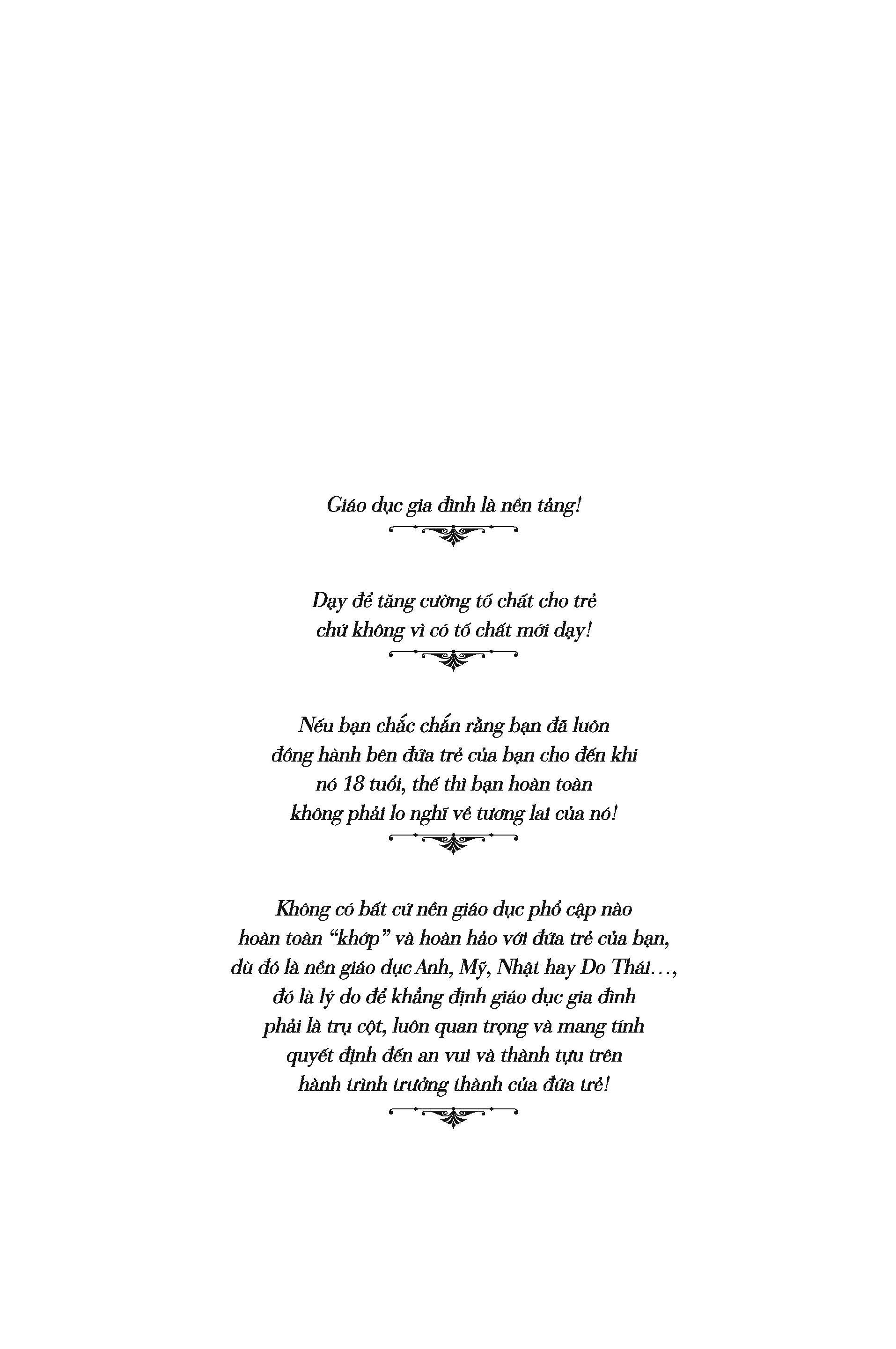 Theo tác giả, trên chặng đường làm mẹ, cần tâm niệm những “triết lý giáo dục” như: Giáo dục gia đình là nền tảng; dạy để tăng cường tố chất cho trẻ chứ không vì có tố chất mới dạy. Hay “nếu bạn chắc chắn rằng bạn đã luôn đồng hành bên đứa trẻ của bạn cho đến khi nó 18 tuổi, thế thì bạn hoàn toàn không phải lo nghĩ về tương lai của nó”, hoặc “không có bất cứ nền giáo dục phổ cập nào hoàn toàn khớp và hoàn hảo với đứa trẻ của bạn, dù đó là nền giáo dục Anh, Mỹ, Nhật hay Do Thái…, đó là lý do để khẳng định giáo dục gia đình phải là trụ cột, luôn quan trọng và mang tính quyết định đến an vui và thành tựu trên hành trình trưởng thành của đứa trẻ”…