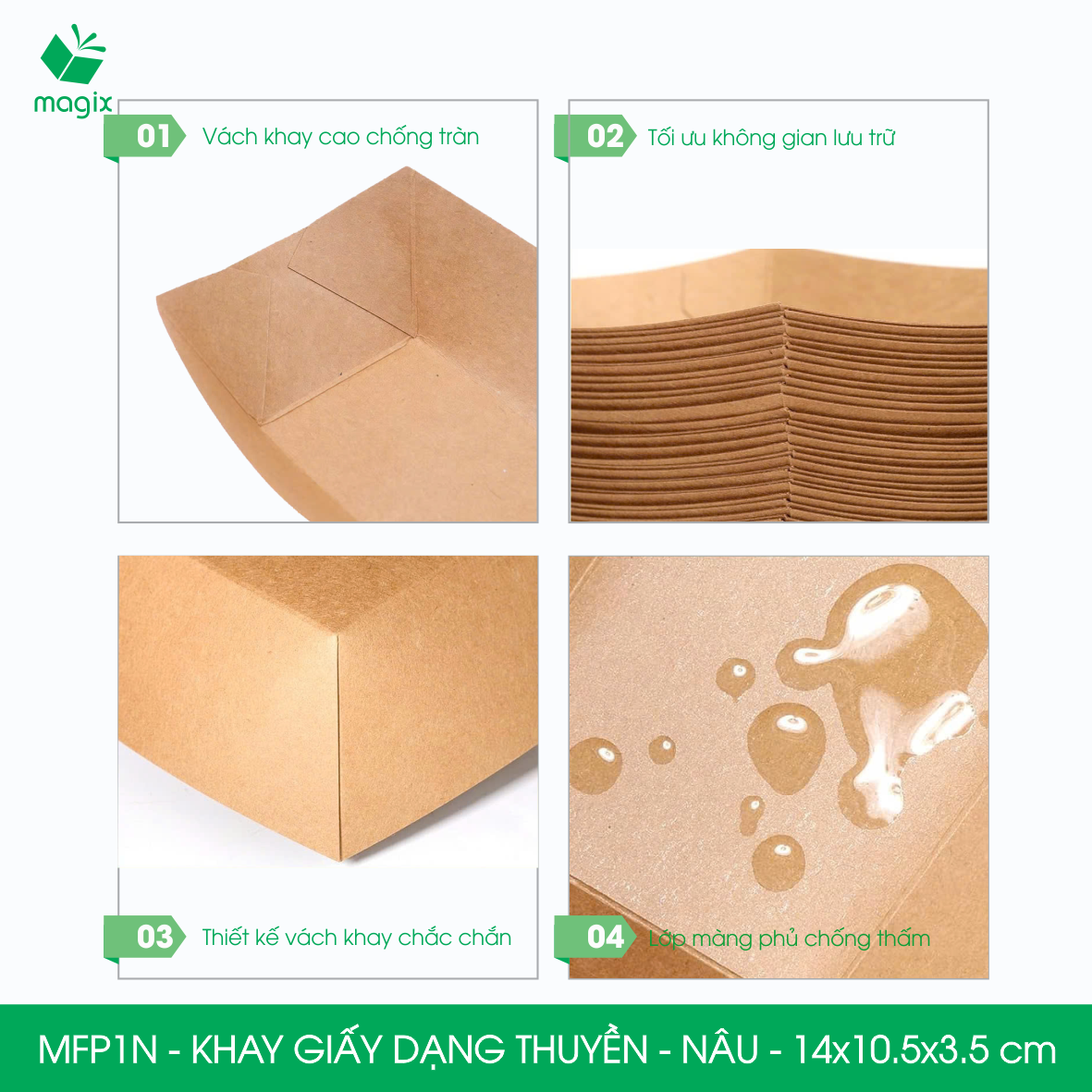 QUY CÁCH KỸ THUẬT Chất liệu: Giấy kraft Màu sắc: Nâu Kích thước: • MFP1N (Miệng: 14x10.3 cm - Đáy: 8.5x5 cm - Cao: 3.5 cm) • MFP2N (Miệng: 16.5x11.5 cm - Đáy: 10x6 cm - Cao: 4.2 cm) • MFP3N (Miệng: 18x13 cm - Đáy: 10.7x7 cm - Cao: 4.5 cm) • MFP4N (Miệng: 22x16 cm - Đáy: 14x8.5 cm - Cao: 5.5 cm)