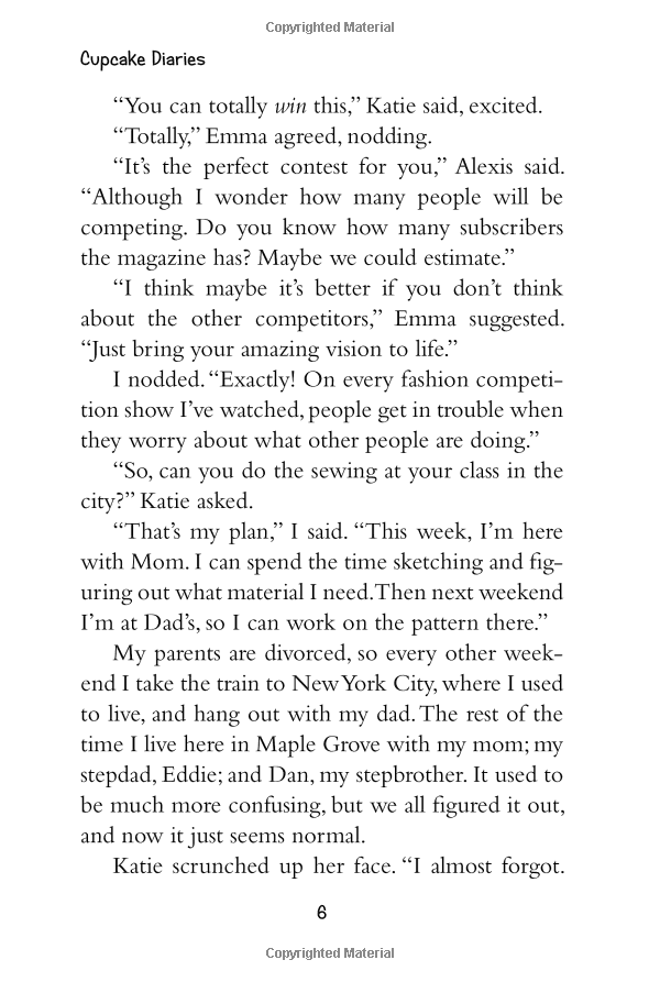 Mia is excited to enter a Design-a-Dress contest, but she's pressed for time. And when she tries to finish working on her dress during a Halloween cupcake party, it's a recipe for disaster! When Mia reads about a Design-a-Dress contest in a magazine for "budding designers ages 12-16" she is excited. But she doesn't realize how much work designing--and sewing--a dress truly is until she starts on her contest entry.