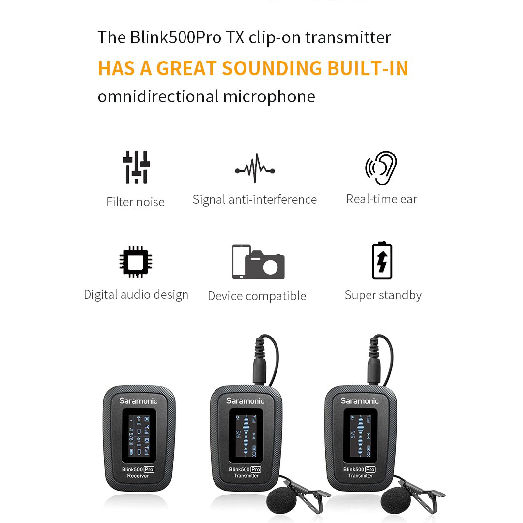 Saramonic Blink500 Pro B2 Saramonic Blink 500 Pro B2(TX+TX+RX) là bộ Microphone không dây tiện dụng, nhẹ, nhỏ gọn, dùng cho máy ảnh DSLR, Mirrorless và máy quay phim, hoặc các thiết bị di động, mang