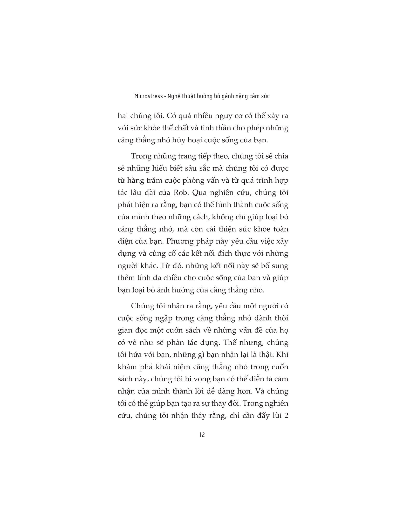 Microstress - Nghệ Thuật Buông Bỏ Gánh Nặng Cảm Xúc Có một thế lực ngầm tác động lên cuộc sống hàng ngày mà chúng ta không hề hay biết, làm chệch hướng sự nghiệp và cuộc sống đầy hứa hẹn. Đó chính là các “căng thẳng nhỏ”. Những căng thẳng nhỏ sẽ là một con “quỷ” ăn sâu vào tâm trí và tích lũy hàng ngày. Từng chút, từng chút một, chúng dần lớn lên và gây nên những tổn hại về sức khỏe tinh thần, làm suy giảm sức khỏe thể chất của chúng ta. Những lúc mệt mỏi, sức lực cạn kiệt, phần lớn mọi người thường tìm đến giấc ngủ. Vì họ chỉ nghĩ trạng thái đó là do những căng thẳng trong công việc mà hình thành. Thế nhưng thực chất, nguyên nhân của sự cạn kiệt năng lượng này là các “Microstress - căng thẳng nhỏ”. Trong Microstress – Nghệ thuật buông bỏ gánh nặng cảm xúc, Rob Cross và Karen Dillon giải thích những cơ sở khoa học đằng sau hiện tượng này, đồng thời mang đến những phương pháp xây dựng tính kiên cường trước những căng thẳng vi mô và cuối cùng là tìm ra mục đích giúp bạn thoát khỏi thế lực xâm lấn âm thầm đang cướp đi cuộc đời bạn. Cuốn sách sẽ trợ giúp mọi người: