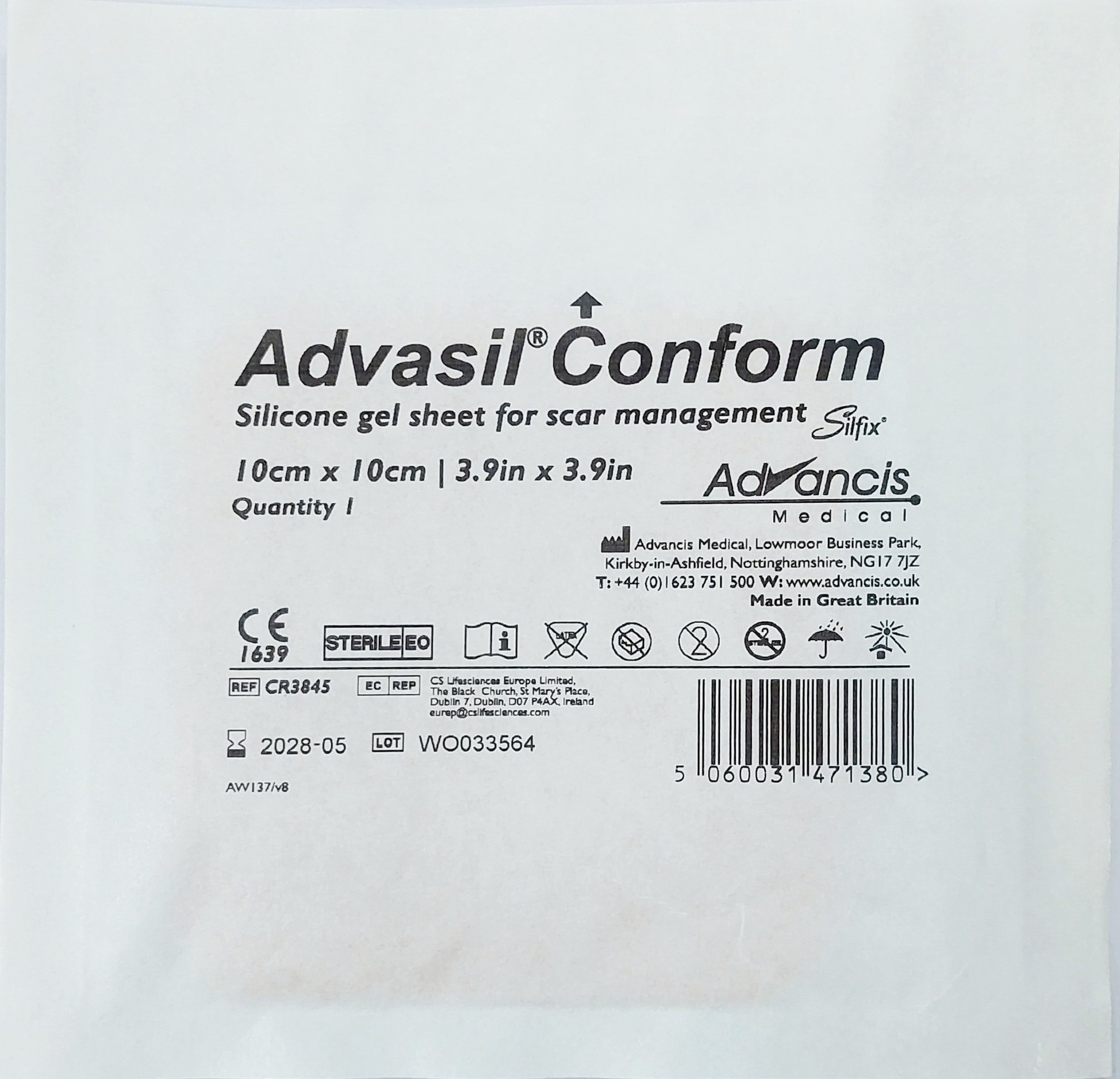 ADVASIL CONFORM Miếng dán Silicone ngăn ngừa và hỗ trợ điều trị sẹo lồi Kích cỡ: 10x10 cm và 10x15 cm Sản phẩm của ADVANCIS – ANH QUỐC Số lưu hành sản phẩm: 180000877/PCBA-HCM Đạt tiêu chuẩn chất lượng Châu Âu và ISO 13485: 2012 Mô tả sản phẩm: Một miếng dán Silicone mềm tự dính, lớp ngoài là màng film polyurethane để ngăn Silicone dính vào quần áo người sử dụng. Lớp gel silicone trong suốt với một lớp polyurethane mịn bên ngoài, bao phủ vùng mô sẹo, dễ chịu, rửa nước được và có thể sử dụng được đến 28 ngày. Chỉ định:  Dùng cho vết thương mới lành, ngăn ngừa và hỗ trợ điều trị sẹo lồi, đặc biệt là người có cơ địa sẹo lồi. Ít nhất hai tuần sau phẩu thuật, vết thương phải kín miệng, không còn vẩy và không còn rỉ dịch mới bắt đầu sử dụng sản phẩm này. Dùng trong nhiều tuần để ngăn ngừa lên sẹo, hoặc dùng trong nhiều tháng để hỗ trợ điều trị sẹo lồi. Chống chỉ định: Không dùng cho vết thương hở, không dùng cho bệnh nhân có bệnh về da. Hướng dẫn sử dụng: