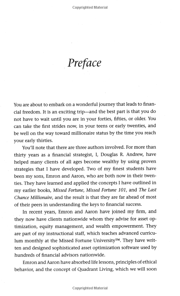 There are approximately 100 million people in America between the ages of 16 and 30. This generation has just entered, or will soon be entering, the work force and they have no idea how to invest, save or handle their money. Young people today come out of school having had little or no formal education on the basics of money management. Many have large debts from student loans looming over their heads and many feel confused and powerless when their pricey educations don't translate into high paying jobs. They feel that their $30,000-$40,000 salary is too meager to bother with investing, and they constantly fear that there will be 'too much month left at the end of their money'. Douglas R. Andrew has shown the parents of this generation a different pathway to financial freedom. Now Doug and his sons, Emron and Aaron - both of whom are in their mid-20s - show the under-30 crowd how they can break from traditional 401k investment plans and instead can find a better way by investing in real estate, budgeting effectively, avoiding unnecessary taxes and using life insurance to create tax-free income .
