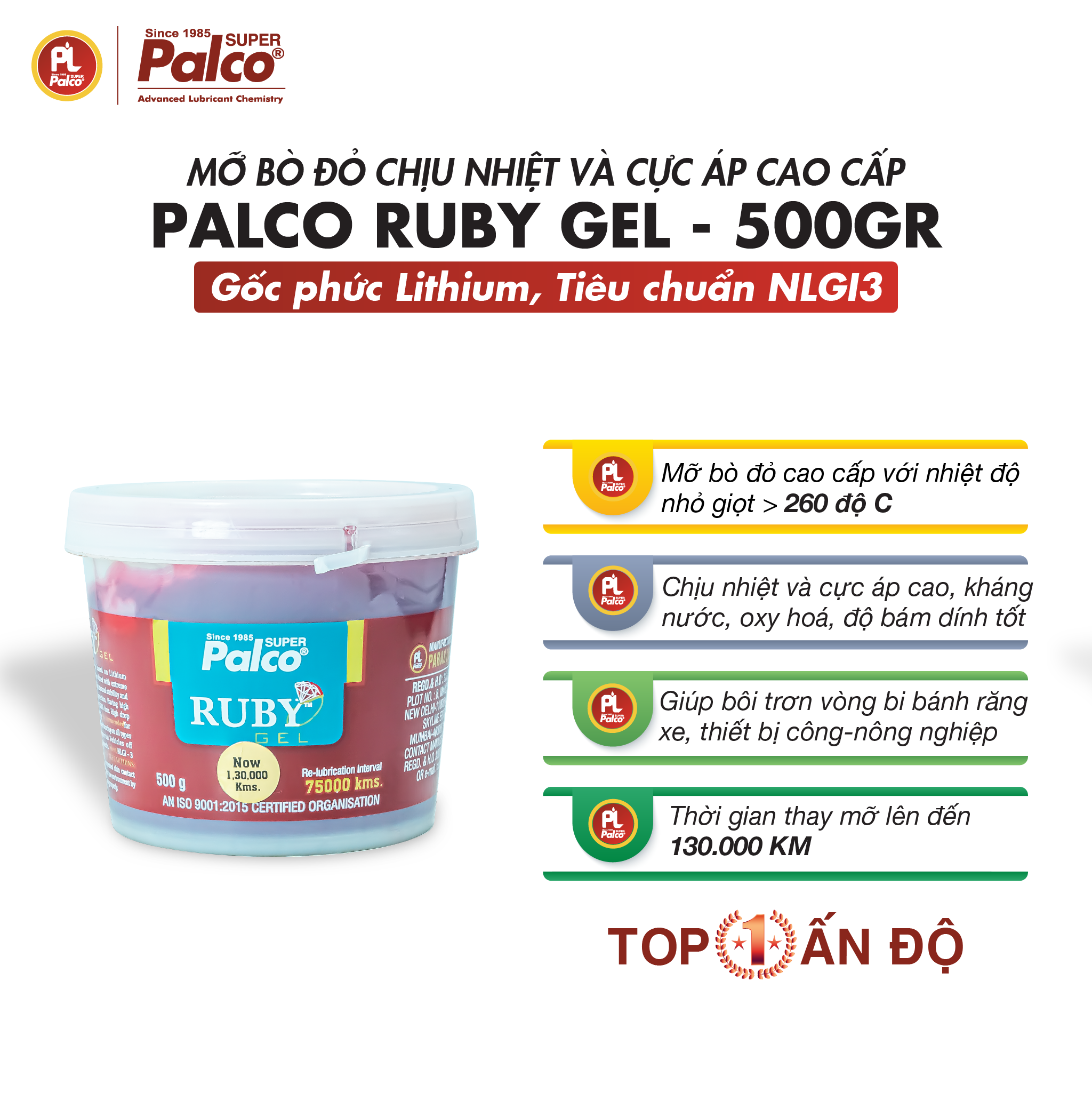 Mỡ bò chịu nhiệt cao cấp PALCO Ruby Gel chịu nhiệt và cực áp rất cao, độ bám dính tốt, bôi trơn, chống rỉ sét và ăn mòn, kháng nước. Mỡ bò đỏ Ruby Gel dùng cho vòng bi bánh răng tất cả các dòng xe chở khách, xe thương mại, ô tô tải và thiết bị nông - công nghiệp. Nhà sản xuất PALCO tự hào khoảng thời gian thay mỡ bò đỏ Ruby Gel đột phá lên đến 130.000 KM.