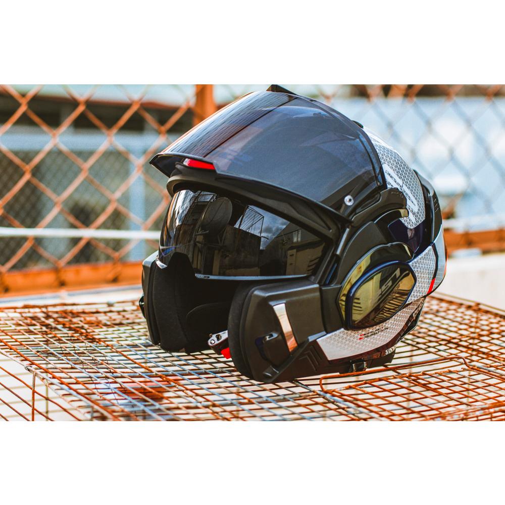 Bên cạnh kính chắn ngoài, mũ còn có thể nâng cấp thêm kính phụ màu tối bên trong giúp bảo vệ mắt người đội khỏi ánh nắng mặt trời. Kính trong có thể di chuyển lên, xuống dễ dàng nhờ hệ thống lật mở nhanh chóng được bố trí bên hông mũ. Cho phép người dùng nhanh chóng lật kính trong lên khi di chuyển vào những khu vực thiếu sáng như đường hầm.
