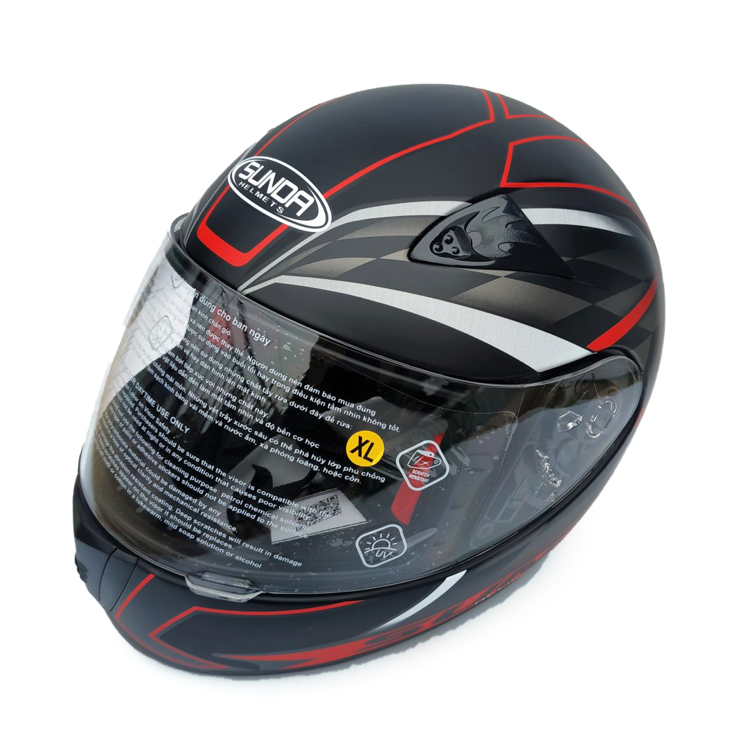 Mũ bảo hiểm fullface Sunda 2000c đen nhám tem đỏ: Nón được thiết kế nhỏ gọn, lòng nón sâu, phù hợp cho người có vòng đầu từ 55-59 cm - đây là size phổ biến của người VN trưởng thành Sunda 2000c là sản phẩm có độ bền cao, chịu được va đập tốt, thiết kế thời trang thông minh, bảo vệ an toàn trên mỗi hành trình của bạn. Vỏ mũ: Sản phẩm mũ bảo hiểm Sunda cam kết luôn sử dụng nhựa ABS nguyên sinh 100% được nhập khẩu từ các nhà cung ứng uy tín như Hàn Quốc, Malaysia, Thái, Nhật chịu được độ va đập cao. Hệ thống thông gió trên thân mũ:  giúp tản nhiệt. Với thiết kế thông minh, phía trước mũ có 2 lỗ thông gió hình tam giác có thể dễ dàng đóng/ mở bằng cách trượt nhẹ, giúp người sử dụng luôn cảm thấy thông thoáng, đồng thời ngăn chặn hoàn toàn nước mưa khi thay đổi thời tiết. Bộ phận thông gió dưới cằm: có hình dạng hình tam giác có thể được mở bằng cách đẩy lên và có thể đóng bằng cách đẩy nắp xuống, giúp không khí lưu thông vào bên trong mũ. Lưới dưới cằm: vừa giúp tạo cảm giác thông thoáng vừa có tác dụng ngăn chặn côn trùng. Kính: được làm từ vật liệu chất lượng cao, đã qua xử lý đặc biệt, cho góc quan sát rộng, hình ảnh rõ nét, trung thực, không bị chói đèn, có khả năng chống tia UV400, chắn gió, chống xước. Kính được thiết kế tháo lắp dễ dàng bằng tay không, không cần sử dụng dụng cụ hỗ trợ. Khóa mũ: sử dụng khóa E8 dễ đóng, mở, chịu được lực kéo mạnh, chắc chắn,  đảm bảo an toàn tốt nhất cho người sử dụng. Dây mũ: dài, chắc chắn, có thể điều chỉnh linh hoạt phù hợp với nhu cầu của người sử dụng. Vải lót cao cấp được xử lý kháng khuẩn, thấm hút tốt, mau khô, giúp hạn chế nguy cơ mắc các bệnh về tóc và da đầu. Mút xốp: là bộ phận quan trọng của nón, được thiết kế để có thể hấp thụ lực khi xảy ra tai nạn. Do đó Sunda luôn cam kết sử dụng xốp nguyên sinh để đảm bảo chất lượng tốt nhất cho sự an toàn của người sử dụng. Mũ thiết kế nhiều lỗ thông gió phía trước và sau mũ, các lỗ này có thể đóng mở được, đảm bảo bạn luôn cảm thấy thoải mái và dễ chịu khi sử dụng.   *** Hướng dẫn xác định cỡ mũ phù hợp: Vòng 1 sợi dây quanh đầu, phía trên lông mày và tai khoảng 2cm. Xiết sợi dây sao cho ôm vừa đủ thoải mái lấy đầu và ghi lại số đo đó. Lặp lại như vậy để tìm được số đo mà bạn thấy đầu dễ chịu nhất. Đó chính là size đầu của bạn. So sánh với kích thước mũ để tìm size mũ phù hợp.