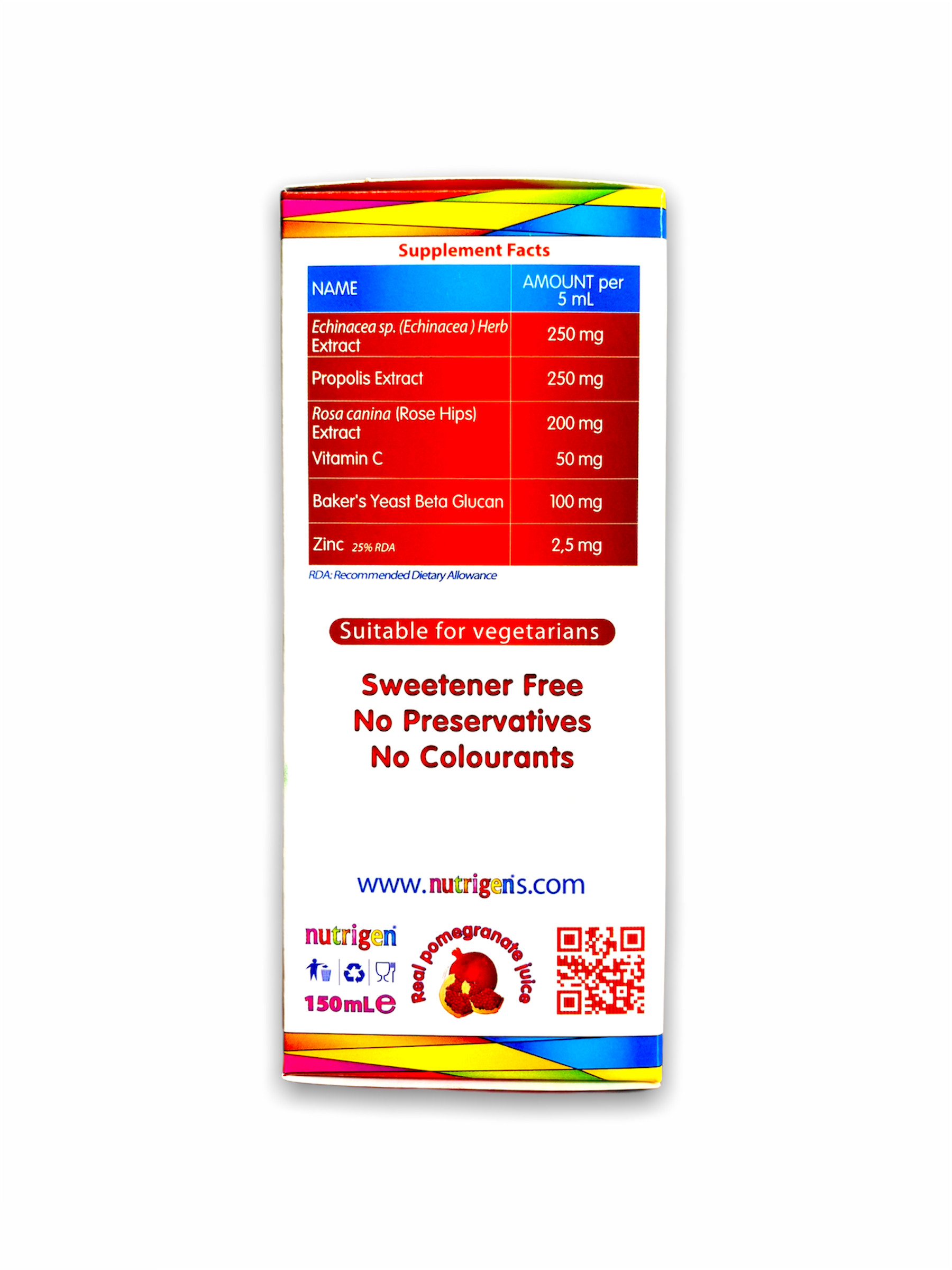 - Giảm số ngày bị sốt Thành phần Chiết xuất cúc nhím (Echinacea sp.), Chiết xuất keo ong, Chiết xuất nụ tầm xuân (Rosa Canina), Vitamin C (acid L-ascorbic), Beta glucan chiết xuất từ nấm men, Kẽm (Kẽm sulfat). Phụ liệu: Nước khử ion, fructose (hoa quả), nước ép lựu cô đặc, chất điều chỉnh acid (Trinatri citrate dihydrat, acid citric), hương lựu tự nhiên, chất làm dày (xanthan gum). Công dụng Hỗ trợ nâng cao sức khỏe, hỗ trợ tăng cường sức đề kháng, hỗ trợ giảm nguy cơ viêm đường hô hấp trên do sức đề kháng kém. Đối tượng sử dụng Trẻ em hay bị viêm đường hô hấp trên khi thay đổi thời tiết, giao mùa do sức đề kháng kém, có nhu cầu bổ sung để tăng cường sức đề kháng. Hướng dẫn sử dụng Khuyến cáo hàng ngày: Trẻ 2-4 tuổi: 5ml/lần, 2 lần/ngày Trẻ 4-11 tuổi: 7,5ml, 2 lần/ngày Khuyến cáo Không sử dụng quá liều hàng ngày. Không sử dụng thay thế cho chế độ ăn bình thường. Không sử dụng cho người mẫn cảm với bất kì thành phần nào của sản phẩm. Thực phẩm này không phải là thuốc và không có tác dụng thay thế thuốc chữa bệnh. Lắc kỹ trước khi dùng. NSX: Xem trên hộp. HSD: 36 tháng kể từ ngày sản xuất. HSD in trên hộp. Bảo quản: Nơi khô mát, tránh xa tầm tay trẻ em. Sau khi mở nắp, bảo quản trong ngăn mát tủ lạnh. Sử dụng trong vòng 06 tháng. Quy cách đóng gói: Hộp 1 lọ 150ml Xuất xứ: Vương Quốc Anh Nhà sản xuất: Vivatinell Ltd. Unit 138, Bradley Hall Trading Estate, Bradley Lane, Standish, Wigan, WN6 0XQ, Vương Quốc Anh Thương nhân chịu trách nhiệm về chất lượng: Công ty Cổ phần Dược phẩm AMVI (Amvipharm) Lô B14-3,4 đường N13, khu công nghiệp Đông Nam, Hòa Phú, Củ Chi, TP.HCM Số ĐKSP: 4702/2020/ĐKSP Số XNQC: 2347/2020/XNQC-ATTP