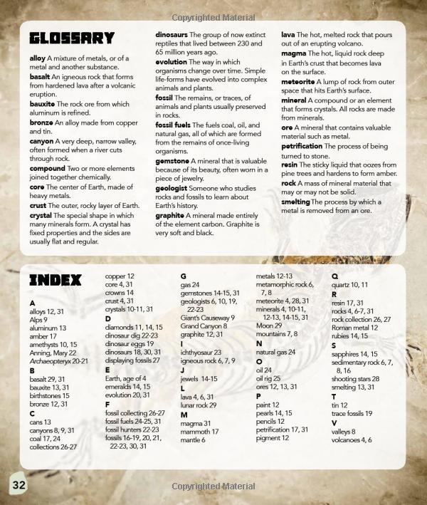 Pack up your gear and get ready to go on a dig. Whether it's iron ore, dazzling gemstones, or a prehistoric creature preserved in amber, exciting discoveries await budding paleontologists and geologists in this informative book. Large and detailed full-color spreads, complemented by clear, concise text unearth the mysteries of rocks, crystals, minerals, and fossils--how they are formed, where they are found, and how they are used. Includes an illustrated glossary and an index to sharpen the young reader's reference skills.