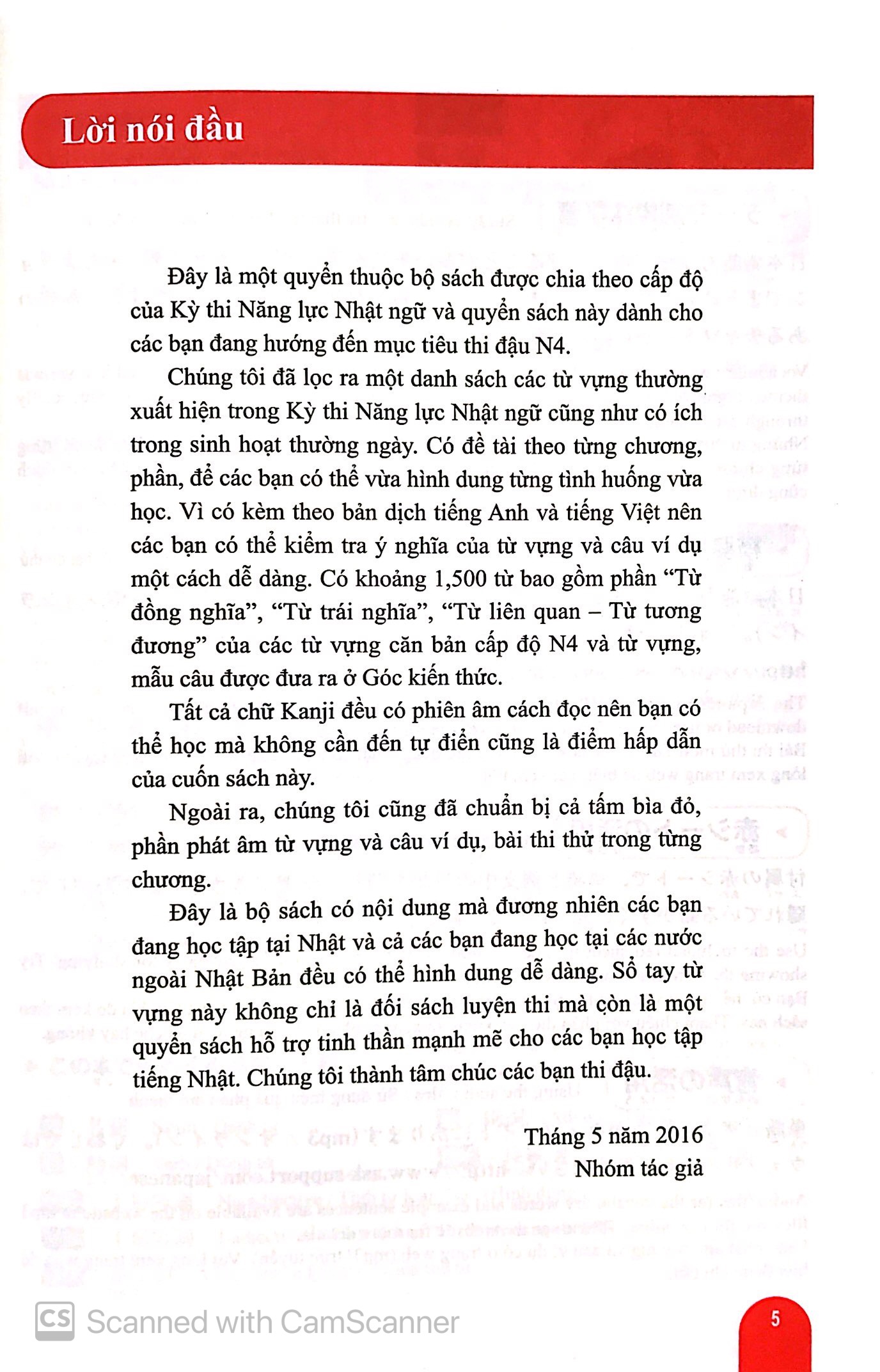 Mua tại TiktokMã hàng 8934974161875 Tên Nhà Cung Cấp NXB Trẻ Tác giả Arc Academy Người Dịch Duy Ngọc NXB NXB Trẻ Năm XB 2020 Trọng lượng (gr) 220 Kích Thước Bao Bì 13 x 19 cm Số trang 200 Hình thức Bìa Mềm Bộ sách học từ vựng cấp độ N5 ~ N1 dành cho Kỳ thi Năng lực Nhật ngữ. Bộ sách gồm 5 cuốn: N1, N2, N3, N4, N5, tập hợp các từ vựng xuất hiện thường xuyên trong các kỳ thi Năng lực Nhật ngữ. Các từ vựng này được chia theo từng chủ đề, đi kèm các câu ví dụ. Đặc biệt bộ sách có kèm theo bản dịch Anh - Trung - Việt, rất tiện cho các bạn tự học ở nhà.