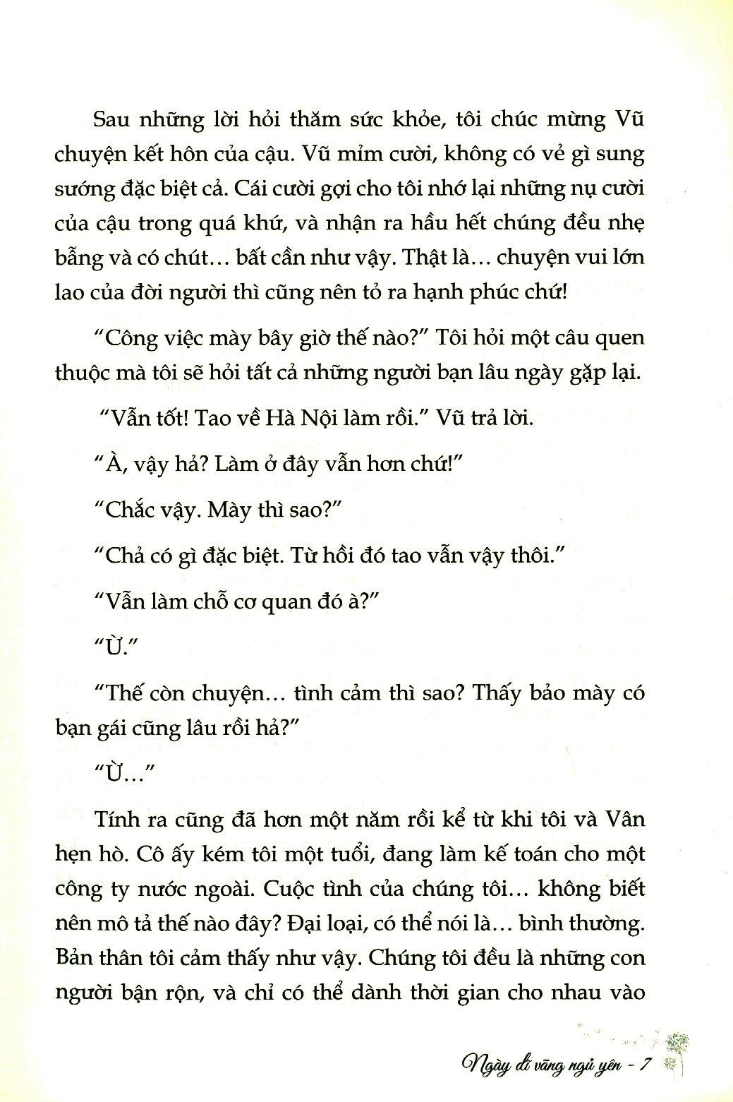 Bản thân tôi cảm thấy như vậy. Chúng tôi đều là những con người bận rộn, và chỉ có thể dành thời gian cho nhau vào dịp cuối tuần. Chúng tôi cùng nhau làm những điều mọi cặp đôi khác đều làm vào cuối tuần: đi chơi, đi ăn, hay đi xem phim. Không có những sự kiện lớn lao, xáo trộn xảy ra trong mối quan hệ của tôi với Vân. Mọi thứ cứ thế trôi đi, và tiến triển, có thể nói như vậy, khi giờ đây cả tôi và nàng đều đã quen với sự hiện diện của nhau trong cuộc sống mỗi người. Cũng có một vài lần chúng tôi đi chơi xa, đi du lịch cùng nhau, trong những dịp nghỉ lễ. Nhưng cũng khó có thể nói rằng đó là những sự kiện đặc biệt. Tôi không rõ Vân có cho chúng là sự kiện đặc biệt hay khô Và theo sự tuần tự của một cuộc tình, đến lúc một trong hai người, hoặc cả hai người, nghĩ đến hôn nhân. Tôi biết Vân muốn kết hôn. Tuy cô ấy chưa hề nói thẳng ra, nhưng những lời bóng gió rất nhiều. Vân có một niềm tin rằng con gái không nên lấy chồng vào năm hai mươi sáu tuổi, và không ngại cho tôi biết điều đó. Chỉ là cô ấy không nói rằng muốn cưới trước hay sau cái năm hai mươi sáu tuổi đó thôi. Năm nay Vân đã hai mươi lăm tuổi. Nói chung, cuộc tình của tôi đang ở giai đoạn có thể tiến đến hôn nhân. Không phải chỉ Vân, cả gia đình tôi cũng mong tôi sớm thành thân. Mẹ tôi luôn nói rằng tôi đã có công ăn việc làm ổn định và cũng sắp không còn trẻ trung gì nữa, nên đã đến lúc tính chuyện trăm năm. Bà vốn rất hài lòng với Vân. Trong con mắt tất cả mọi người, tôi là một kẻ đã trưởng thành đủ để chuyển sang một giai đoạn mới của cuộc đời: có gia đình riêng.