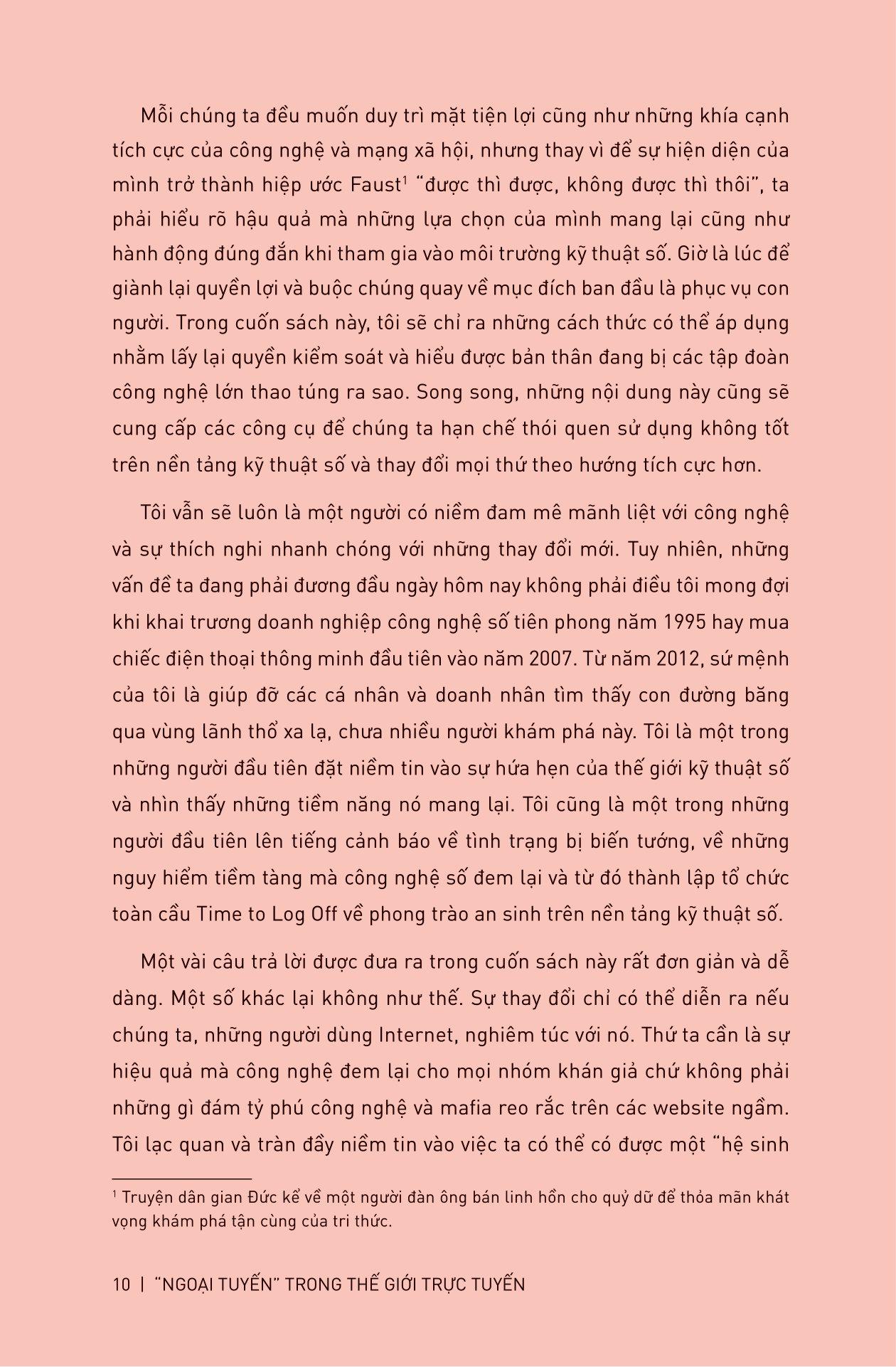 “Ngoại Tuyến” Trong Thế Giới Trực Tuyến Bạn đã sẵn sàng đánh mất điều gì để có một cuộc sống ngập tràn kết nối? Khi Internet trở thành không gian chung cho mọi người nhờ đoạn mã Word Wide Web, không ai nghĩ những kết cục tồi tệ sẽ xuất hiện: tội phạm công nghệ lộng hành, những mối quan hệ đổ vỡ không thể vãn hồi, niềm tin bị chối bỏ, những kẻ giả tạo được tán dương, và cái “like” còn quan trọng hơn cả hành động thật. Lướt web thay vì lắng nghe người khác (phubbing), hoảng sợ khi không mang điện thoại bên m.ình (nomophobia), “thỉnh” bác sĩ Google hơn là đến bệnh viện (cyberchondria) còn hàng ngàn góc khuất nữa của công nghệ đang hiện diện xung quanh, nhưng điều đáng tiếc là ta đã dần chấp nhận và coi những hậu quả đó là lẽ hiển nhiên. “Bắt mạch” từng căn bệnh kỹ thuật số, “Ngoại tuyến” trong thế giới trực tuyến sẽ cùng bạn khám phá cái giá phải trả mà cuộc sống số gây ra cho sự tồn tại thực của chúng ta. Phát hiện những thói quen có hại và tìm ra chìa khóa của sự cân bằng công nghệ, đồng thời giải quyết các chuẩn mực xã hội mới lạ. Trên tất cả, công nghệ được tạo ra để phục vụ chứ không phải thao túng con người và quyền kiểm soát mọi thứ diễn ra vẫn luôn nằm trong tay bạn. Về tác giả: Tanya Goodin là nhà sáng lập phong trào “giải độc kỹ thuật số” Time To Log Off. Đồng thời cô là một tác giả, diễn giả và là nhà tư vấn cho nhiều công ty, tổ chức, cá nhân về phương pháp sử dụng công nghệ một cách lành mạnh. Cô đã từng xuất hiện trên các chương trình BBC Breakfast, Sky News, CCTV, ITN London News… Và cộng tác với các trang tin tức như The Guardian, The Telegraph, London Evening Standard, Marie Claire, The Daily Mail và The Sun.