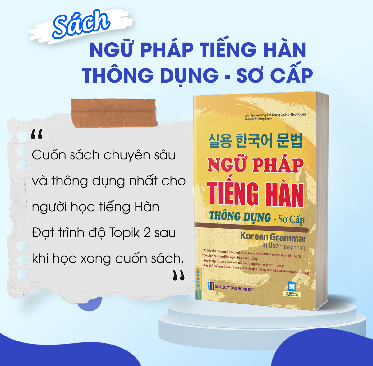 Với cuốn sách này hệ thống bài tập sẽ bám sát hệ thống lí thuyết. Học xong cấu trúc nào bạn được thực hành ngay phần bài tập của cấu trúc đó. Các bài tập đều được chọn lọc một cách kỹ càng, bám sát xu hướng ra đề của các kỳ thi Topik. Đây chắc chắn sẽ là nguồn tài liệu bổ ích cho những ai đang ôn luyện Topik cấp độ 1, cấp độ 2.