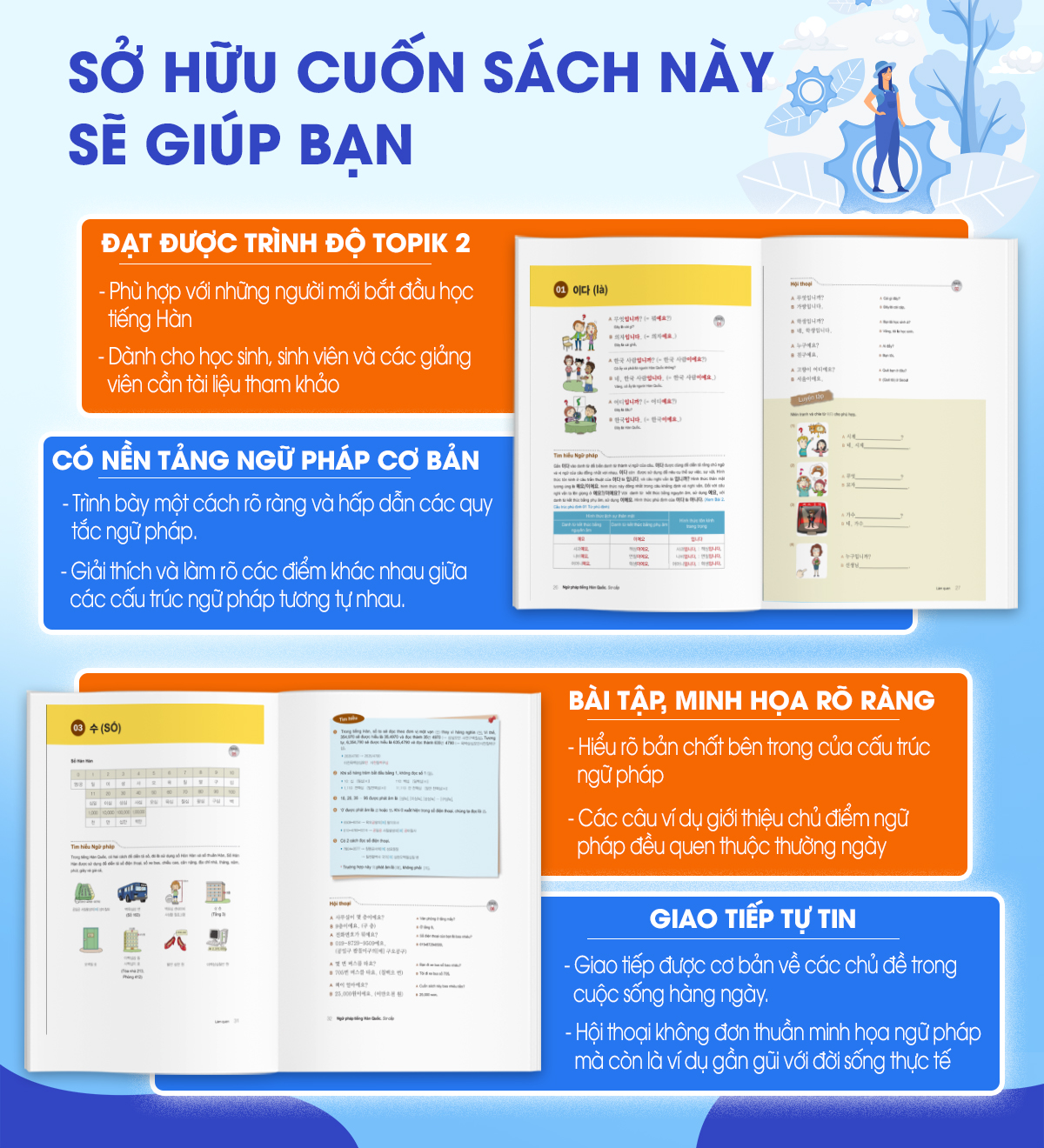 Cuốn sách này được thiết kế hoàn toàn phù hợp với những người mới bắt đầu học tiếng Hàn. Sách gồm có 3 phần chính tổng hợp các kiến thức chính về ngữ pháp tiếng Hàn sơ cấp và thêm nhiều phần kiến thức liên quan: