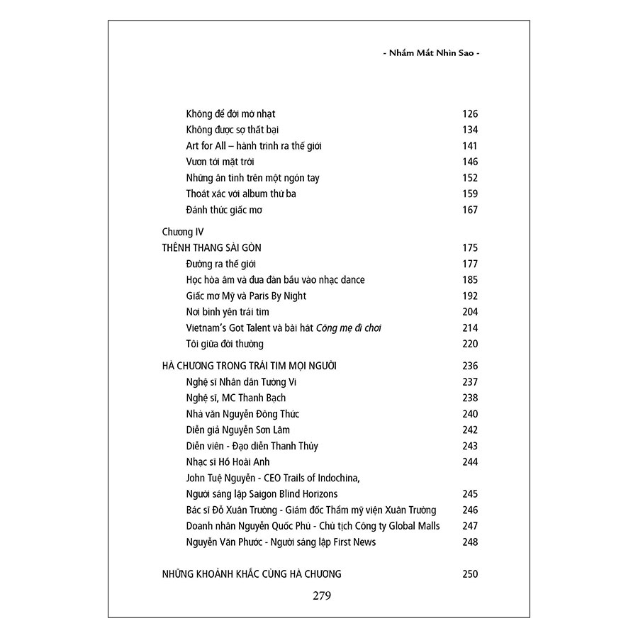 Đây là tự chuyện về cuộc đời của anh - người nhạc sĩ khiếm thị sáng tác và hát qua lăng kính của ánh sáng không màu. Trong tự truyện Nhắm Mắt Nhìn Sao, Hà Chương kể lại câu chuyện đời mình tường tận đến từng giọt nước mắt, từng giọt mồ hôi, chi tiết đến từng giấc chiêm bao, từng phút tủi lòng. Anh kể lại từng khoảnh khắc thăng hoa khi vượt qua chính mình, khi chinh phục được thử thách để bước lên thêm một nấc thang thành công nữa. Anh kể với hy vọng chuyện đời mình sẽ tiếp thêm động lực cho người khác.