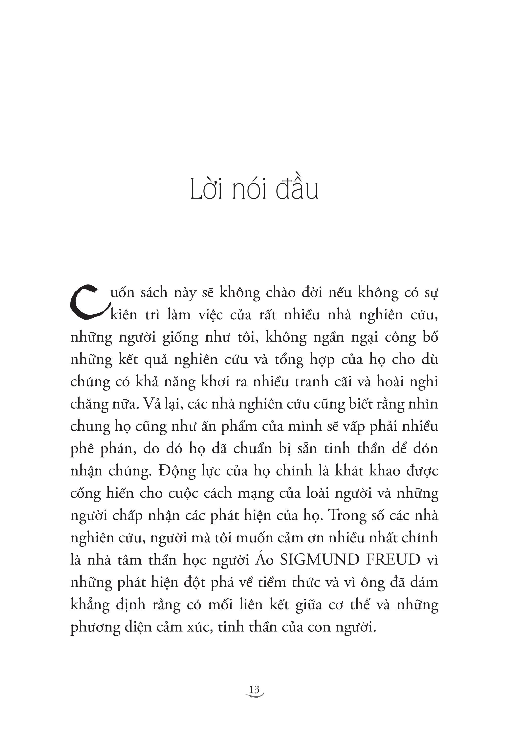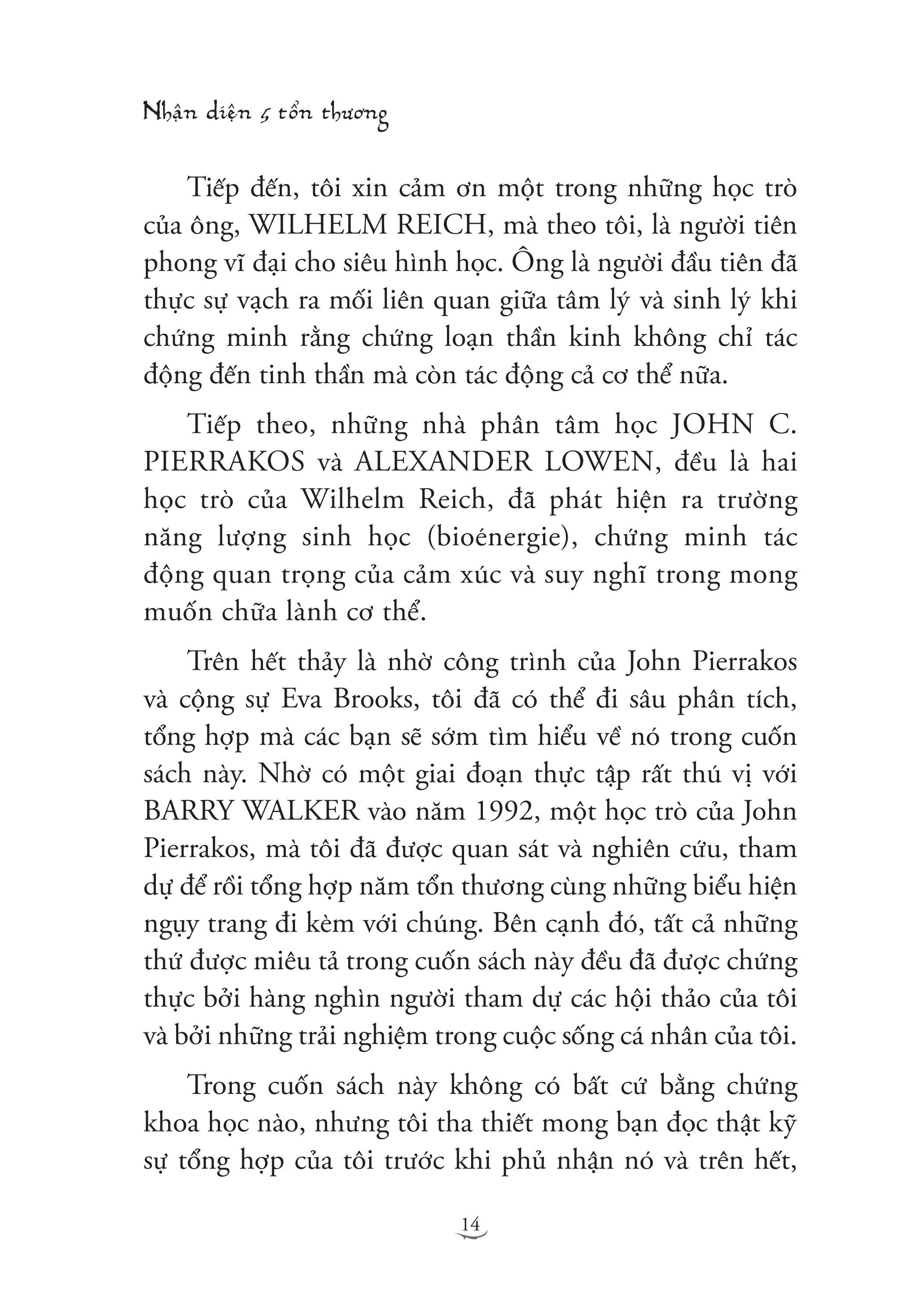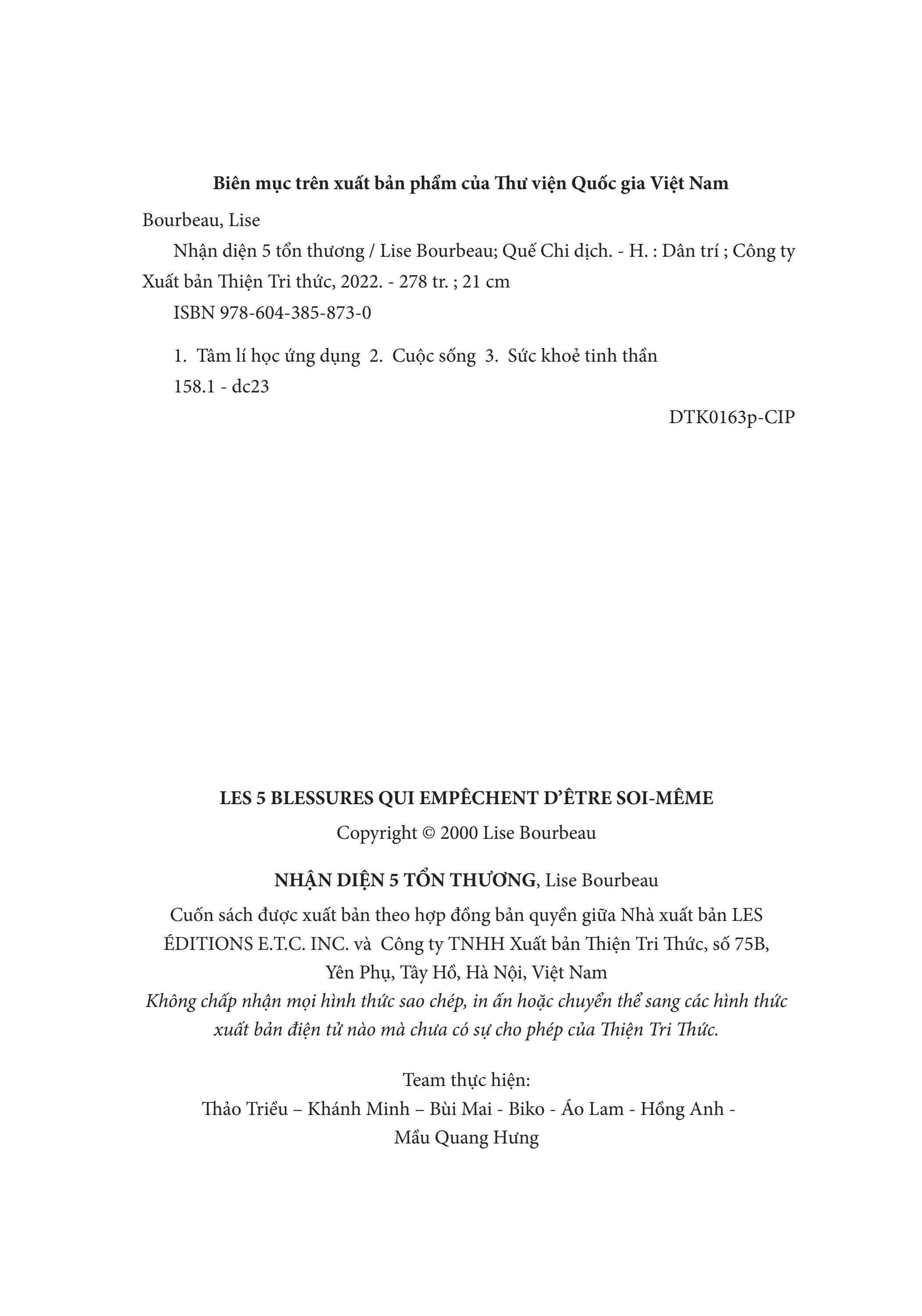 Nhận Diện 5 Tổn Thương GIỚI THIỆU SÁCH: Cuốn sách mô tả những quan sát của tác giả trong hình thể, ngôn ngữ và lời nói của những người đang tái diễn tổn thương (với tổn thương nhục nhã, bị bỏ rơi, bị phủ nhận, bị phản bội, bị đối xử bất công). Nhờ những miêu tả trực giác này của tác giả mà chúng ta có thể phán đoán được một người đang bị ảnh hưởng nhiều bởi chấn thương cảm xúc nào, và việc tự đánh đồng chấn thương cảm xúc đầu đời ấy đã tác động lên cuộc đời họ, cách họ sinh hoạt, nói năng, cách họ đưa ra các lựa chọn của đời m.ình, và rồi được biểu hiện qua cơ thể ra sao. Qua những tổn thương đó, chúng ta thấy được mối quan hệ giữa mặt nạ vô thức ta mang trong quá trình đối phó với những tổn thương và biểu hiện của chúng trên cơ thể ta. Thông qua cuốn sách, chúng ta dần thấu hiểu tâm thức của con người và có thể rút ra được bài học cho chính m.ình trên hành trình “thành nhân” (theo cách nói của Carl Rogers) hay “thành toàn tự ngã” (theo cách nói của Carl Jung) của mỗi chúng ta. TÁC GIẢ: Lise Bourbeau là tác giả nổi tiếng toàn cầu, bà đã viết 20 cuốn sách, trong đó có nhiều đầu sách best-seller về chủ đề lắng nghe cơ thể và nhận diện những tổn thương bên trong. Sách của bà được dịch ra gần 20 ngôn ngữ trên thế giới. Từ khi thành lập trường phái nghiên cứu của m.ình vào năm 1982, những tư tưởng của bà đã giúp đỡ rất nhiều người cải thiện chất lượng cuộc sống và tạo ra những thay đổi bền vững hàng ngày. Lắng nghe cơ thể bạn, trường phái phát triển bản thân có sức ảnh hưởng lớn nhất ở Quebec, đã được truyền bá trong các buổi hội thảo trên hơn 20 quốc gia và trong 10 thứ ngôn ngữ. Bộ sách “Nhận diện 5 tổn thương” và “Chữa lành 5 tổn thương” là hai trong số rất nhiều đầu sách best-seller của bà. TRÍCH ĐOẠN SÁCH HAY: Khi một đứa trẻ được sinh ra, tự trong sâu thẳm nó đã biết lý do vì sao nó đầu thai. Đó chính là được làm chính m.ình trong khi sống qua rất nhiều trải nghiệm. Vả lại, linh hồn nó đã chọn gia đình và hoàn cảnh sống để sinh ra cùng với một mục tiêu rất cụ thể. Tất cả chúng ta đều có một nhiệm vụ giống nhau khi đến với Trái đất này: trải nghiệm cuộc sống cho đến khi nào chúng ta chấp nhận nó và trong quá trình đó yêu thương lấy m.ình. Chừng nào chúng ta còn chưa chấp nhận một trải nghiệm nào đó, tức là vẫn còn phán xét nó, vẫn còn dằn vặt vì nó, sợ hãi, tiếc nuối nó, hay mọi dạng không chấp nhận khác, chừng đó con người ta còn không ngừng thu hút vào m.ình những hoàn cảnh, sự kiện và con người đẩy ta quay trở lại với trải nghiệm đó một lần nữa. Một số người, không chỉ gặp cùng một trải nghiệm nhiều lần trong đời, mà còn phải đầu thai một hay nhiều lần nữa thì mới có thể hoàn toàn chấp nhận nó. Chấp nhận một trải nghiệm nào đó không có nghĩa là chúng ta mong muốn có nó hay đồng tình với nó, mà đúng hơn là cho phép ta cảm thụ và học hỏi từ những gì ta đã trải qua. Đặc biệt chúng ta phải học cách nhận ra cái gì là có ích cho m.ình, cái gì là không. Cách duy nhất để nhận ra điều đó là trở nên ý thức về hậu quả của mỗi trải nghiệm. Tất cả những gì mà ta đã lựa chọn hoặc không lựa chọn, tất cả những gì mà ta đã làm hoặc không làm, tất cả những gì mà ta đã nói hoặc không nói và thậm chí tất cả những gì ta đã nghĩ và không nghĩ, đã cảm và không cảm đều để lại hậu quả. Trước khi đi vào miêu tả các giai đoạn chữa lành cho mỗi loại tổn thương và mặt nạ ngụy trang, tôi xin được chia sẻ với các bạn những quan sát liên quan tới cung cách đi đứng, nằm ngồi, nhảy mú của những người thuộc từng loại tổn thương. Điều này sẽ làm rõ sự khác nhau về hành vi của các mặt nạ. Tùy theo mặt nạ mà cách nói chuyện và giọng nói của người ta sẽ khác: