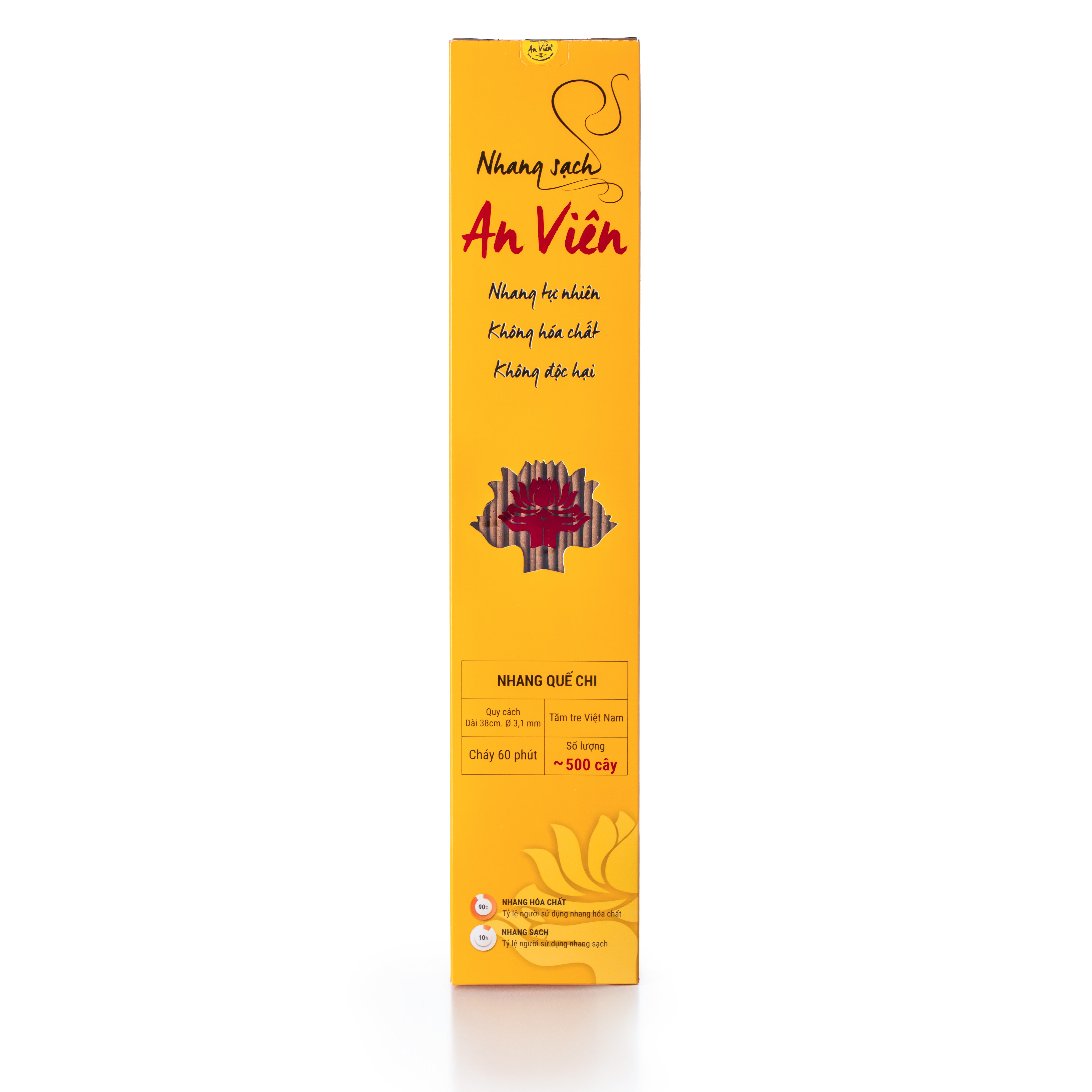 Nhang quế An Viên 4 tấc (hộp 500 cây) Nhang tự nhiên - không hóa chất - không độc hại Nguyên liệu tự nhiên: lá cây quế, vỏ cây quế, keo bời lời Quy cách: đường