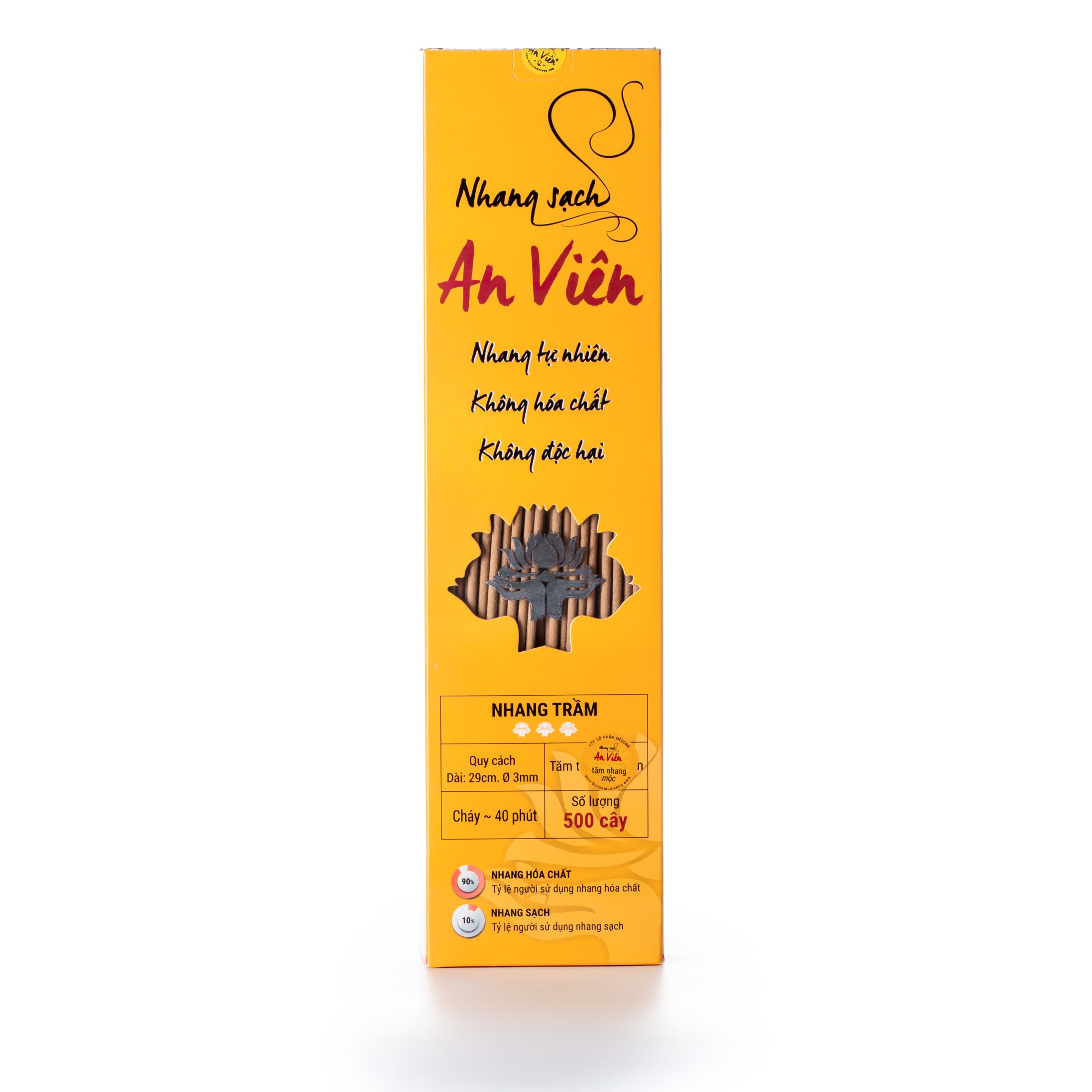 Mua tại TiktokNhang trầm An Viên 3 tấc (hộp 500 cây) Nguyên liệu: Bột trầm tự nhiên kết hợp với keo bời lời tự nhiên. Quy cách: đường kính 3mm - Dài: 29,5cm. Tăm tre nhập khẩu Đài Loan Thời gian cháy: ~ 45 phút/ cây (tùy điều kiện gió) Thích hợp sử dụng trong phòng kín, máy lạnh, tốt cho sức khỏe. Đặc biệt là nhà có trẻ nhỏ, không gây hại đường hô hấp, khí quản, tim mạch