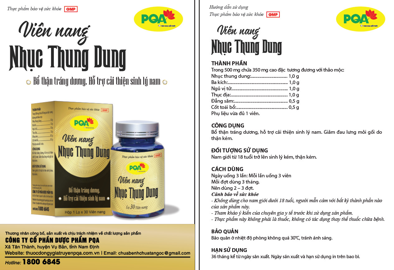 Nhục Thung Dung PQA Bổ Thận Tráng Dương, Hỗ Trợ Cải Thiện Sinh Lý Nam Và Giảm Đau Lưng Mỏi Gối Hộp 30 Viên THÔNG TIN SẢN PHẨM: - Xuất xứ: Việt Nam - Dung