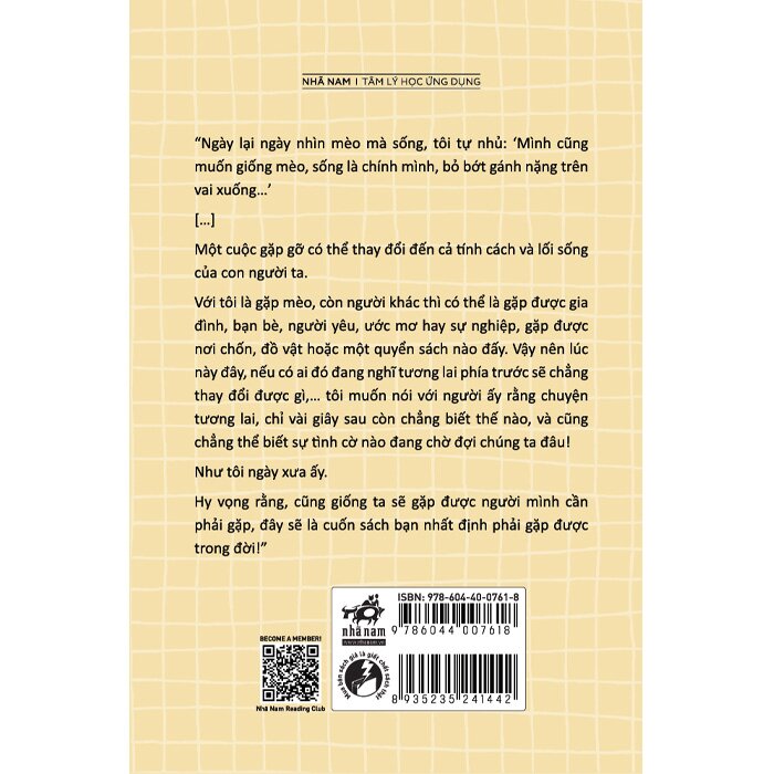 Với tôi là gặp mèo, còn người khác thì có thể là gặp được gia đình, bạn bè, người yêu, ước mơ hay sự nghiệp, gặp được nơi chốn, đồ vật hoặc một quyển sách nào đấy. Vậy nên lúc này đây, nếu có ai đó đang nghĩ tương lai phía trước sẽ chẳng thay đổi được gì, tôi muốn nói với người ấy rằng chuyện tương lai, chỉ vài giây sau còn chẳng biết thế nào, và cũng chẳng thể biết sự tình cờ nào đang chờ đợi chúng ta đâu!