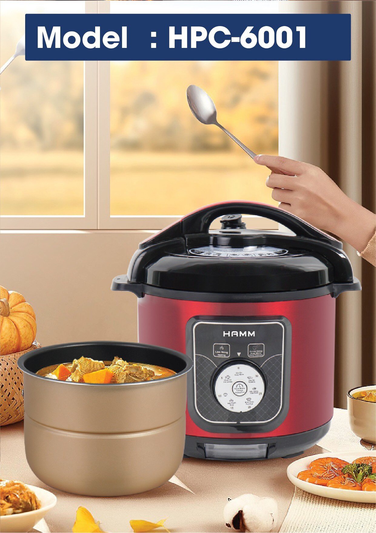 - Bảng điều khiển rõ ràng, dễ hiểu, tùy chỉnh tiện lợi với núm vặn Nồi Áp Suất Điện HAMM HPC-6001 - Màu Ngẫu Nhiên - Hàng Chính Hãng được thiết kế bảng điều khiển tiếng Việt dễ hiểu, núm vặn dễ sử dụng. Chỉ cần xoay núm đến loại thực phẩm cần chế biến, nồi sẽ tự động điều chỉnh nhiệt độ và áp suất, thời gian phù hợp. NINH KỸ HẦM NHỪ - GIỮ TRỌN VỊ NGON