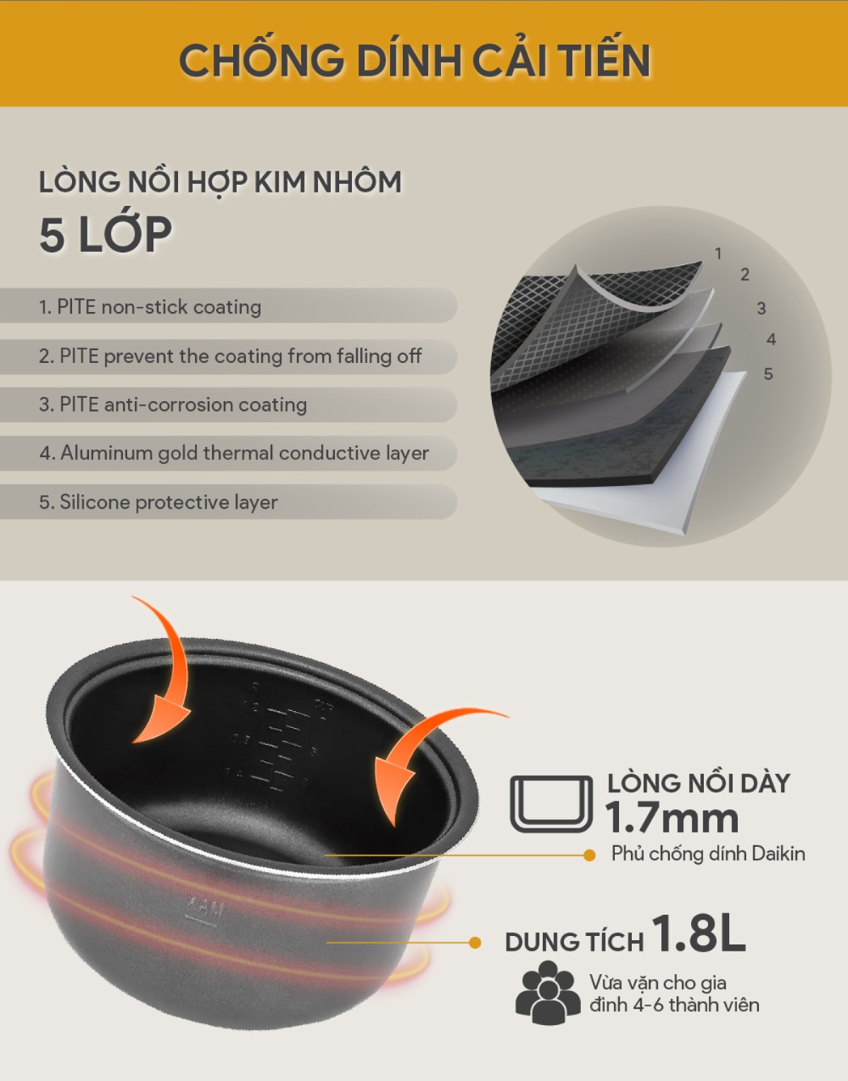Thiết kế lòng nồi hợp kim nhôm 5 lớp phủ lớp chống dính Daikin dễ dàng vệ sinh và an toàn sức khỏe.