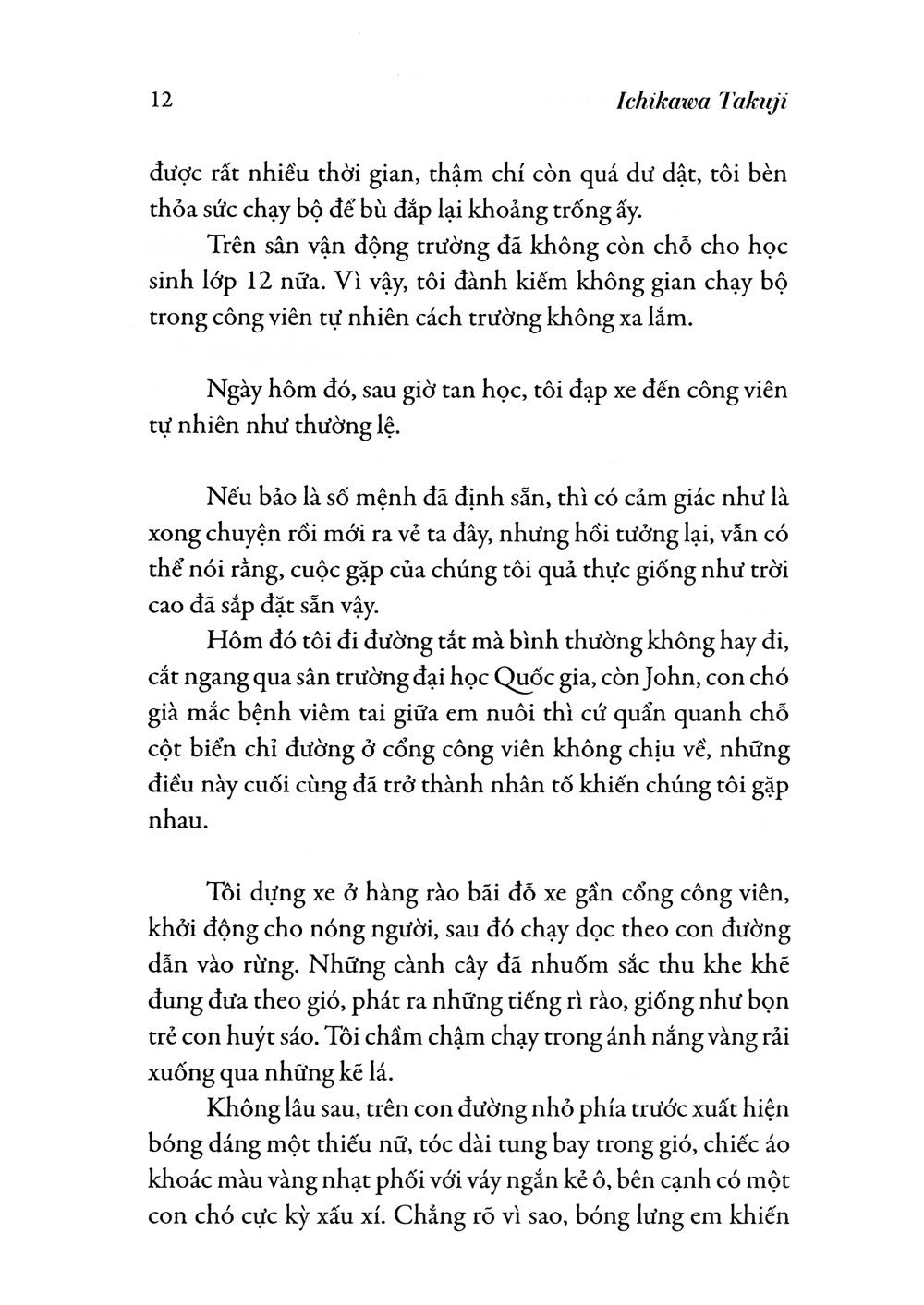 Vẫn giọng văn nhẹ nhàng pha chút hài hước, như thể một cậu bé mới lớn đang thủ thỉ kể chuyện, Tchikawa Takuji một lần nữa khắc họa bức tranh tình yêu và chia ly bằng gam mầu sáng trong. Mỗi tác phẩm của ông là một lần thanh lọc tâm hồn người đọc.