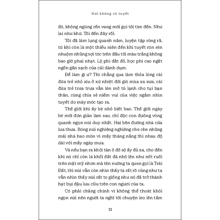 Nơi không có tuyết - tức là nói về miền nhiệt đới ẩm ương oi nồng. Chốn đó ngày xưa có cậu nhóc hết sức tò mò với cỗ máy lạ lùng có tên “tủ lạnh”, đôi buổi trưa hè lại rón rén mở cánh cửa ấy ra để thỏa niềm đam mê xem “tuyết” ra đời. Nhiều năm sau nhóc con ấy lớn khôn, dốc lòng học tập, dành dụm tiền tự lắp ráp cho mình chiếc phi cơ hòng chinh phục đỉnh tuyết băng vĩnh cửu Hy Mã Lạp Sơn. Giữa đêm trường bão tuyết, số mệnh đã run rủi cho “phi công” ấy mối duyên lạ kỳ với một bông tuyết xa xưa, bé tí ti thôi, nhưng là chứng nhân cho bao nỗi buồn thương của muôn người muôn vật trên Trái Đất tự xa xôi ngút ngàn. Một cuộc hàn huyên bắt đầu