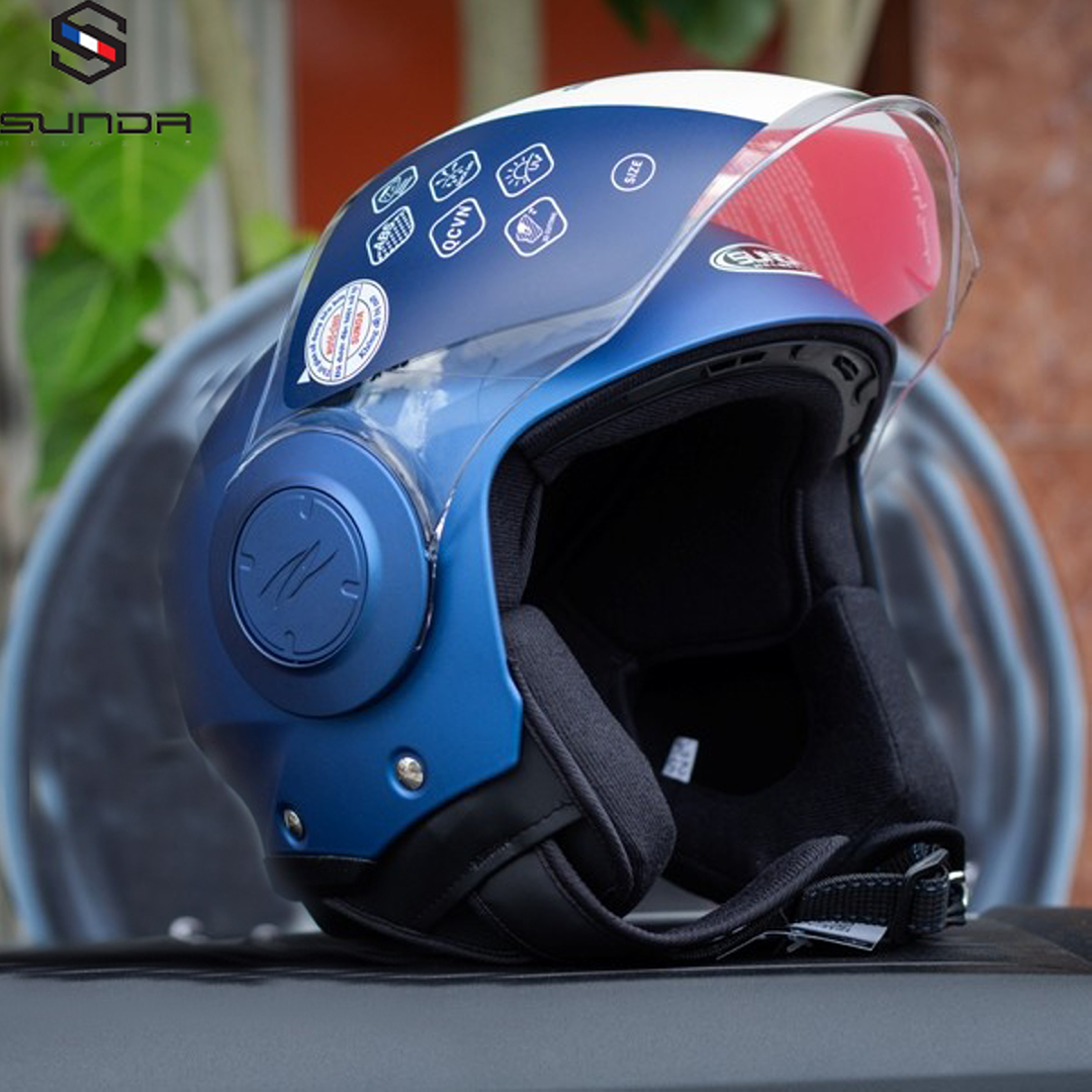Mũ bảo hiểm nửa đầu có kính Sunda 180B tem là phụ kiện không thể thiếu khi đi xe mô tô, xe máy, mang lại sự an toàn và phong cách thời trang cho người sử