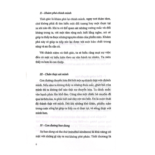 Nội dung sách được chia làm ba phần:   Phần Một : Những Nguyên Tắc Chung   Khảo sát thực trạng căn bản của chúng ta: bản chất và nguyên nhân những dạng thức phiền