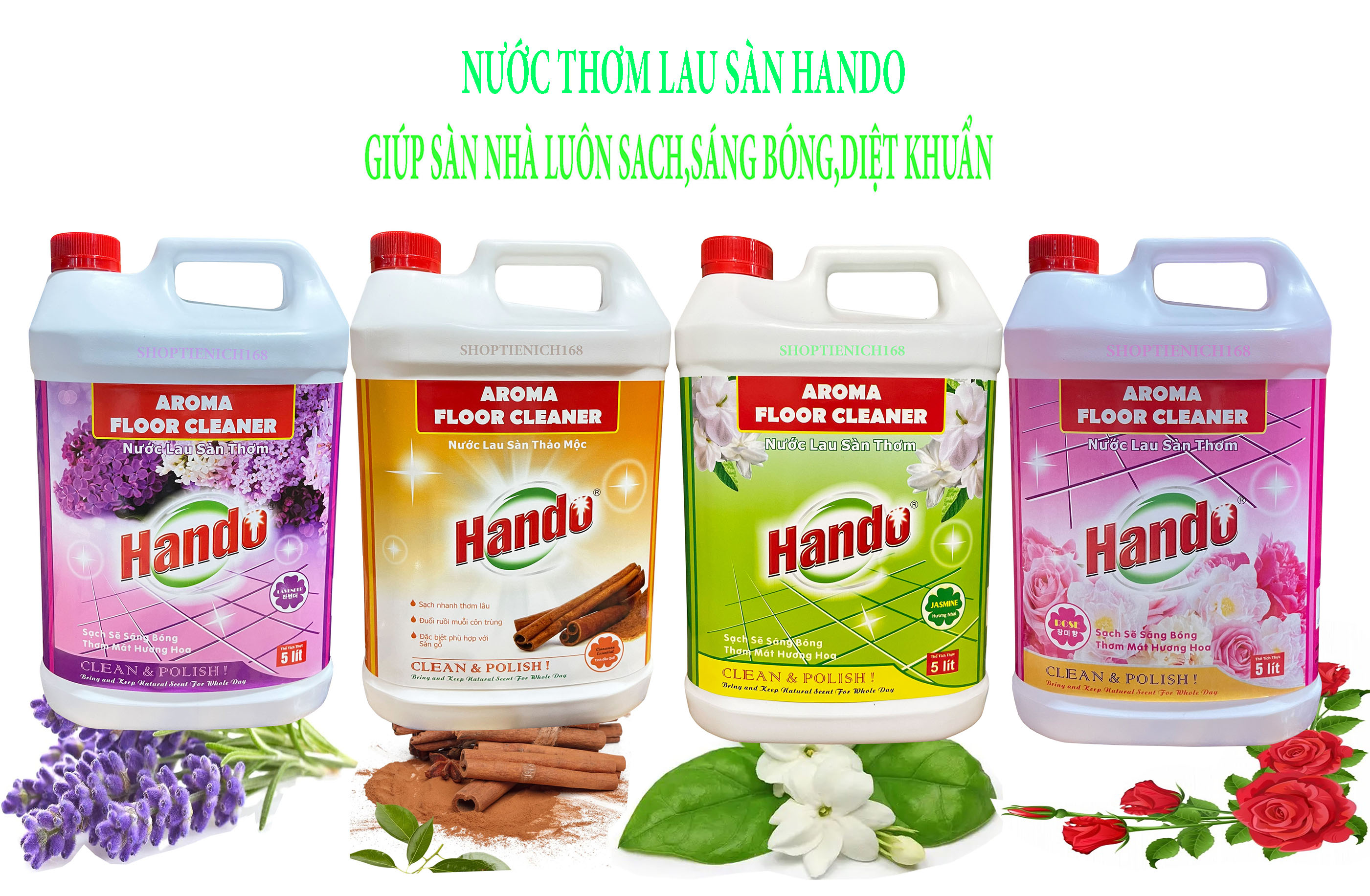 Tên sản phẩm : Nước lau sàn đậm đặc siêu sạch Hando 1L Mùi hương : Hương hoa nhài , Hương hoa hồng , Hương lavender, Hương tinh dầu xả, Hương tinh dầu quế. Kích