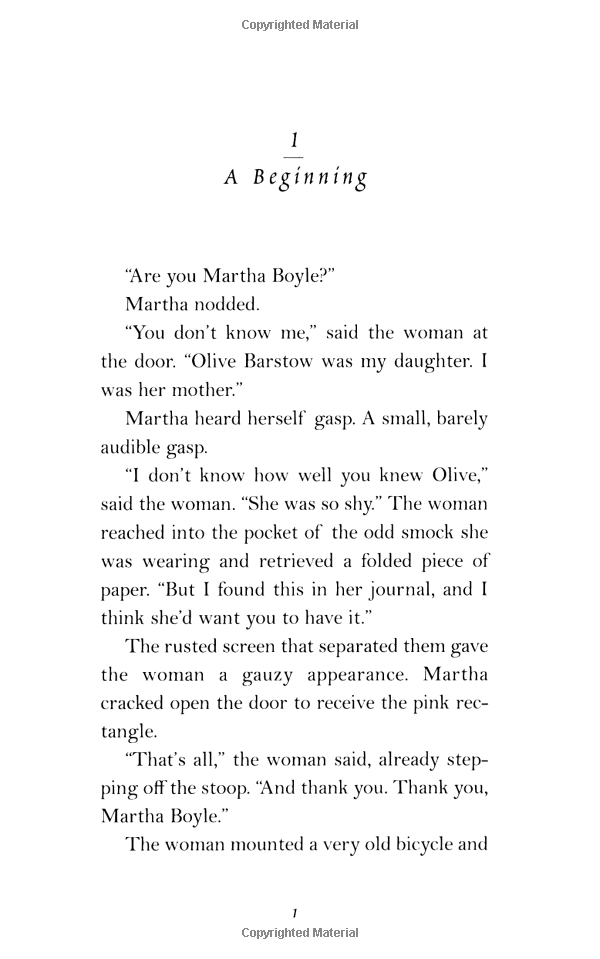 Sometimes life can change in an instant Martha Boyle and Olive Barstow could have been friends, but they weren't. Weeks after a tragic accident, all that is left are eerie connections between the two girls, former classmates who both kept the same secret without knowing it. Now, even while on vacation at the ocean, Martha can't stop thinking about Olive. Things only get more complicated when Martha begins to like Jimmy Manning, a neighbor boy she used to despise. What is going on? Can life for Martha be the same ever again?