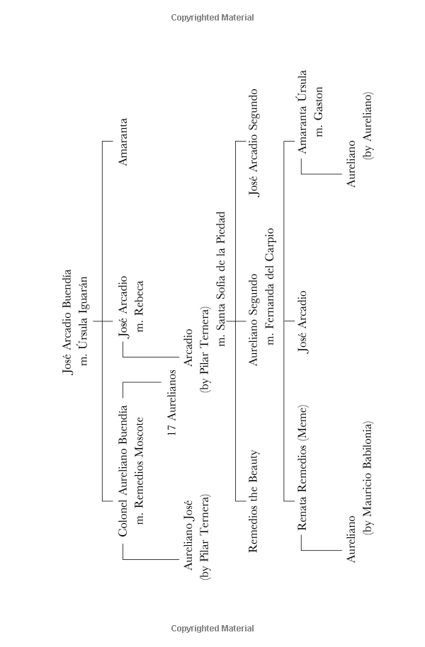 A trickle of blood came out under the door, crossed the living room, went out into the street, continued on in a straight line across the uneven terraces, went down steps and climbed over curbs, passed along the Street of the Turks, turned a corner to the right and another to the left, made a right angle at the Buendía house, went in under the closed door, crossed through the parlor, hugging the walls so as not to stain the rugs, went on to the other living room, made a wide curve to avoid the dining-room table, went along the porch with the begonias, and passed without being seen under Amaranta's chair as she gave an arithmetic lesson to Aureliano José, and went through the pantry and came out in the kitchen, where Úrsula was getting ready to crack thirty-six eggs to make bread.