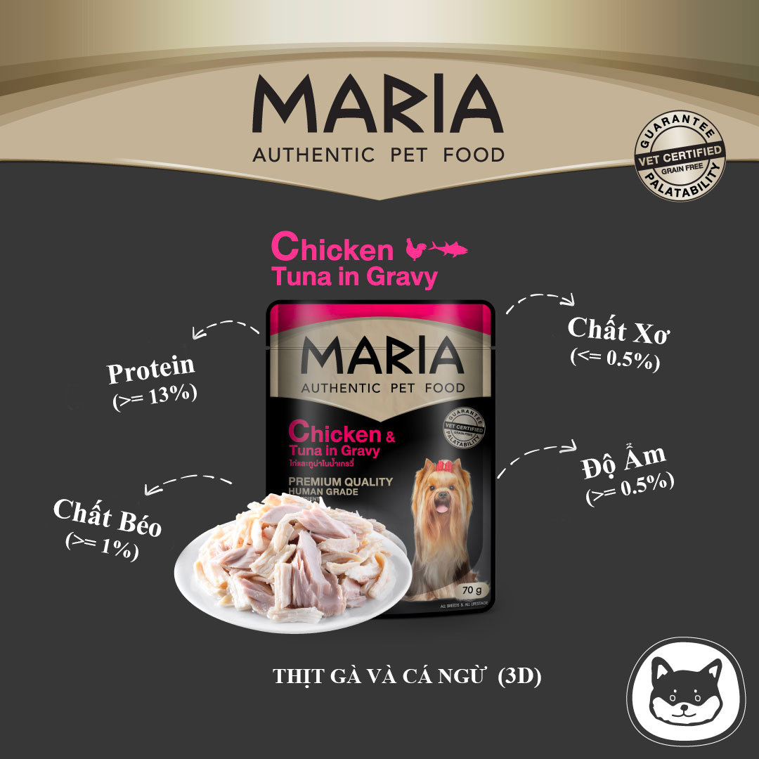 Thức ăn cho chó mèo cao cấp thương hiệu Maria, sản xuất tại Thái Lan, được làm từ 100% các loại thịt được chọn lọc thực tế và kiểm soát chất lượng tỉ mỉ trong từng khâu từ quy trình sản xuất đến đóng gói. Thức ăn cho chó mèo thương hiệu Maria không chứa tạp chất và chất bảo quản, không chứa thành phần ngũ cốc gây dị ứng. Ngoài ra, sản phẩm còn chứa Axit béo omega-3 nuôi dưỡng trí não và da lông, bổ sung Prebiotics giúp tăng cường hệ tiêu hóa, nguyên liệu tươi ngon và đầy đủ chất dinh dưỡng, hương vị thơm ngon, hỗ trợ sức khỏe của chó mèo một cách toàn diện nhất.