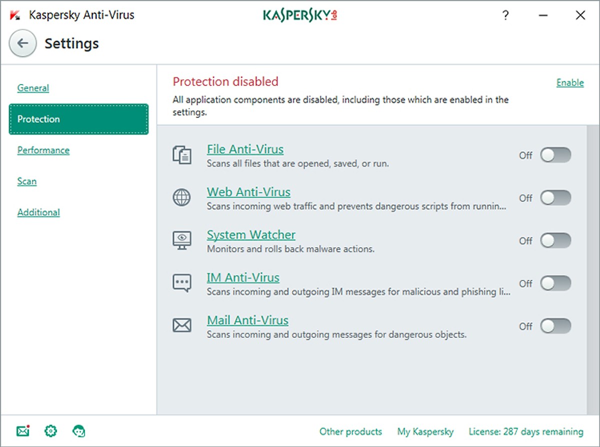 Bảo vệ máy tính Mỗi loại mối đe dọa được xử lý bởi một thành phần chuyên dụng. Bạn có thể bật và tắt các thành phần bảo vệ, và cấu hình thiết lập của