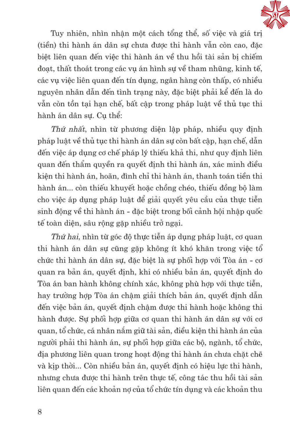 ''Pháp luật thủ tục thi hành án dân sự'' Nội dung cuốn sách bao gồm 10 chương, tập trung phân tích từng vấn đề cụ thể về thủ tục trong thi hành án dân sự hiện nay ở Việt Nam và liên hệ với pháp luật thi hành án dân sự ở một số quốc gia trên thế giới.