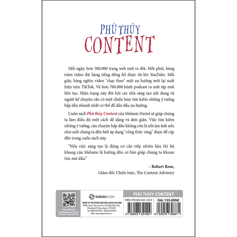 Tác giả Melanie là người tiên phong trong lĩnh vực marketing nội dung và là một trong những bộ óc thông minh nhất trong ngành. Trong khi có rất nhiều bộ khung chiến lược nội dung rối rắm với 47 ô và các mũi tên chĩa vào nhau thì Phù thủy content lại rất đơn giản, dễ tiếp cận và sẽ giúp bạn sáng tạo các ý tưởng kể chuyện hay hơn.