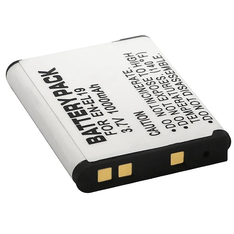 Kiểu Pin tiêu chuẩn, Li-Ion, Pin sạc Sản phẩm: EN-EL19 Vôn: 3.7V Dung tích: 1000mAh Tiêu chuẩn CE Thời gian làm việc: hơn 300 lần Sử dụng: Máy ảnh Các mẫu pin tương thích cho